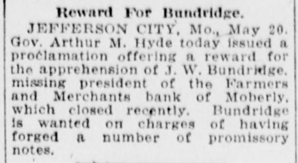 Moberly, Mo., March 13.-Vern E. Bundridge, former cashier of the defunct Farmers and Merchants' Bank of Moberly, which closed May 11, 1922, with a shortage of approximateby $400,000, will be rearrested when he leaves the Missouri state penitentiary on April 12, a capias on grand jury indictment having been sent to the sheriff of Cole county today The capias is on an indictment returned by a grand jury in Moberly in 1923, which charges the former banker with forgery of a $1800 note. Prosecuting Attorney W. M. Stringer said today that Bundridge would be tried on this indictment and that five other indictments returned by the same grand jury, also charging forgery, will be filed against him. The indictments are made jointly against Vern Bundridge his brother, Walter, president of the bank, who was sentenced to ten years in the penitentiary. while Vern's tence was for five years. With benefit of good behavior, Vern's term-expires April 12, Walter remaining in prison.