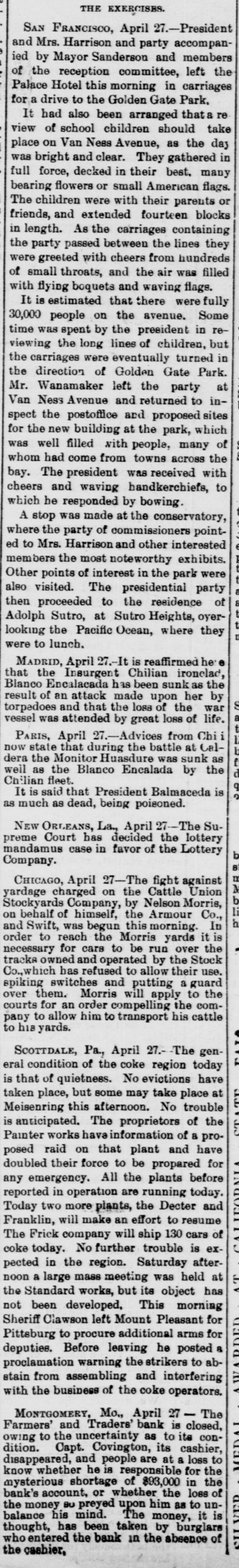 THE EXERCISES. SAN FRANCISCO, April 27.-President and Mrs. Harrison and party accompanied by Mayor Sanderson and members of the reception committee, left the Palace Hotel this morning in carriages for a drive to the Golden Gate Park, It had also been arranged that a re view of school children should take place on Van Ness Avenue, as the day was bright and clear. They gathered in full force, decked in their best. many bearing flowers or small American flags. The children were with their parents or friends, and extended fourteen blocks in length. As the carriages containing the party passed between the lines they were greeted with cheers from hundreds filled of small throats, and the air was with flying boquets and waving flags. It is estimated that there were fully 30,000 people on the avenue. Some time was spent by the president in but reviewing the long lines of children, the carriages were eventually turned in the direction of Golden Gate Park. at Mr. Wanamaker left the party Van Ness Avenue and returned to inspect the postoffice and proposed sites for the new building at the park, which was well filled with people, many of whom had come from towns across the bay. The president was received with cheers and waving handkerchiefs, to which he responded by bowing. A stop was made at the conservatory, where the party of commissioners pointed to Mrs. Harrison and other interested the most noteworthy of interest in members Other points the park exhibits. party were also visited. The presidential of then proceeded to the residence Adolph Sutro, at Sutro Heights, oyerlooking the Pacific Ocean, where they were to lunch. MADRID, April 27. It is reaffirmed he the Insurgent Chilian ironclac, the Blanco that Encalacada has been sunkas by result of an attack made upon her war and that the loss of the vessel torpadoes was attended by great loss of life. PARIS, April -Advices from Chi Calstate that during the battle sunk at now the Monitor Huasdure was the as dera weil as the Blanco Encalada by Chilian fleet. It is said that President Balmaceda is as much as dead, being poisoned. NEW ORLEANS, La., April 27-The SuCourt has decided the lottery preme mandamus case in favor of the Lottery Company. M CHICAGO, April 7-The fight against Union b charged on the Cattle Stockyards yardage Company, by Nelson Morris, Co., h behalf of himself, the Armour In on was begun this morning. to reach the Morris for care to be run over order and Swift, yards Stock it the is necessary owned and operated by has refused to allow Co.,which tracks the their guard use. switches and putting a the spiking them. Morris will apply to comover for an order compelling the cattle courts pany to allow him to transport his to his yards. SCOTTDALE, Pa., April 27. The gencondition of the coke region today have eral is that of quietness. No evictions taken place, but some may take place at Meisenring this afternoon. No trouble the is anticipated. The proprietors of Painter works have information of a proposed raid on that plant and have doubled their force to be propared for emergency. All the plants before any reported in operation are running today. and Today two more plants, the Decter Franklin, will make an effort to resume of The Frick company will ship 130 cars coke today. No further trouble is after- expected in the region. Saturday a large mass meeting was held has at the noon Standard works, but its object not been developed, This morning Sheriff Clawson left Mount Pleasant for Pittsburg to procure additional arms for deputies. Before leaving he posted proclamation warning the strikers to abstain from assembling and interfering with the business of the coke operators. MONTGOMERY, Mo., April 27 - The and Traders' bank is closed, Farmers' to the uncertainty as to its conowing Capt. Covington, its cashier, to dition. and people are at a loss he is responsible for the shortage of of know disappeared, mysterious whether $93,000 in loss the account, or whether the bank's SO preyed upon him as to it un- is the money his mind. The money, balance thought, has been taken by burglars of who entered the bank in the absence the cashier,