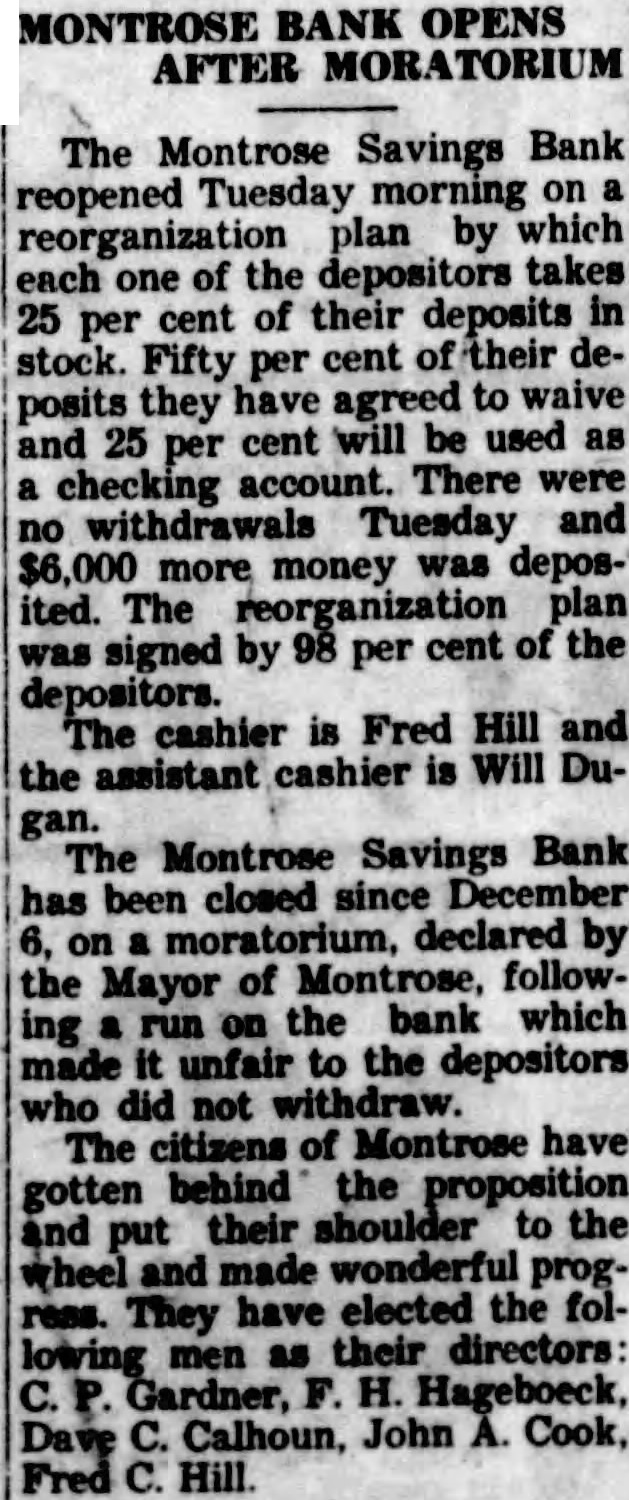 MONTROSE BANK OPENS AFTER MORATORIUM The Montrose Savings Bank reopened Tuesday morning on a reorganization plan by which each one of the depositors takes 25 per cent of their deposits in stock. Fifty per cent of their deposits they have agreed to waive and 25 per cent will be used as a checking account. There were no withdrawals Tuesday and $6,000 more money was deposited. The reorganization plan was signed by 98 per cent of the depositors. The cashier is Fred Hill and the assistant cashier is Will Dugan. The Montrose Savings Bank has been closed since December 6, on a moratorium, declared by the Mayor of Montrose, following a run on the bank which made it unfair to the depositors who did not withdraw. The citizens of Montrose have gotten behind the proposition and put their shoulder to the wheel and made wonderful progress. They have elected the following men as their directors: Gardner, F. H. Hageboeck, Dave C. Calhoun, John A. Cook, Fred Hill.