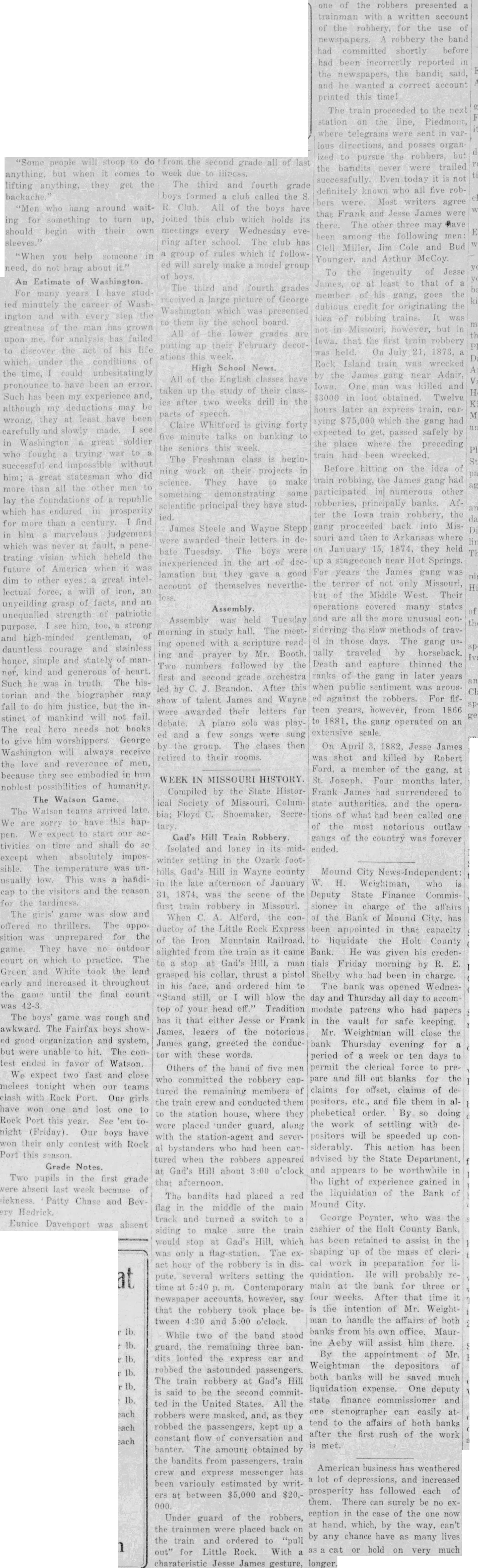 Mound City News-Independent: W. H. Weightman, who is Deputy State Finance Commissioner in charge of the affairs of the Bank of Mound City, has been appointed in that capacity to liquidate the Holt County Bank. He was given his credentials Friday morning by R. E. Shelby who had been in charge. The bank was opened Wednesday and Thursday all day to accommodate patrons who had papers in the vault for safe keeping. Mr. Weightman will close the bank Thursday evening for a period of a week or ten days to permit the clerical force to prepare and fill out blanks for the claims for offset, claims of depositors, etc., and file them in alphebetical order. By so doing the work of settling with depositors will be speeded up considerably. This action has been advised by the State Department, and appears to be worthwhile in the light of experience gained in the liquidation of the Bank of Mound City. George Poynter, who was the cashier of the Holt County Bank, has been retained to assist in the shaping up of the mass of clerimain at the bank for three or four weeks. After that time it is the intention of Mr. Weightman to handle the affairs of both banks from his own office. Maurine Aeby will assist him there. By the appointment of Mr. Weightman the depositors of both banks will be saved much liquidation expense. One deputy state finance commissioner and one stenographer can easily attend to the affairs of both banks after the first rush of the work is met.