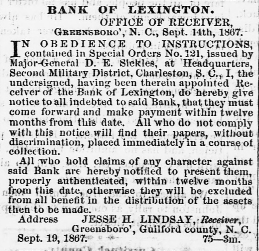 BANK OF LEXINGTON. OFFICE OF RECEIVER, GREENSBORO', N. C., Sept. 14th, 1867. OBEDIENCE TO INSTRUCTIONS, in Special Orders No. 121, issued by Major-General D. E. Sickles, at Headquarters, Second Military District, Charleston, S.C., I, the undersigned, having been therein appointed Receiver of the Bank of Lexington, do hereby give notice to all indebted to said Bank, that they must come forward and make payment within twelve months from this date. All who do not comply with this notice will find their papers, without discrimination, placed immediately in a course of collection. All who hold claims of any character against said Bank are hereby notified to present them, properly authenticated, within twelve months from this date, otherwise they will be excluded from all benefit in the distribution of the assets then to be made. Address JESSE H. LINDSAY, Receiver, Greensboro', Guilford county, N. C. 75-3m. Sept. 19, 1867. PHOTOGRAPH ALBUMS! A SPLENDID LOT JUST TO HAND.Prices from 50 ets. to $10.00 each. BRANSON, FARRAR & CO., Raleigh, N. C. 73-tf. Sept. 14, 1867.