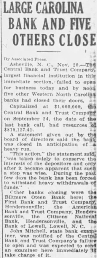 Asheville Bank Closes With Others In Western North Carolina ASHEVILLE, N Nov 20 Central Bank and Trust financial in this section, failed to for business open and five other today noon western North Carolina banks had closed their doors at $1,000,000, the Central Bank and Trust 24, the date of the last bank call, had deposits of Its sources given at that time $21,753,000. Other banks closing were the bank here, including its branch at Osteen Veterans Hospital; the First Bank and Trust company, the American Bank and Trust company, the Citizens National Bank, and the Bank of Lowell. John Mitchell, state bank examiner, notified of the Central Bank Trust company's failure to open and expected to send examiner here immediately to take charge of it. statement given out by the board of directors said the bank was closed in anticipation of heavy To Guard Depositors "This action," statement said, "was taken solely conserve the interests of the depositors and only after became apparent that such step was wise. During the past days the bank been forced to withstand heavy of funds." Wallace R. Davis, civic leader, president of the bank. He was reported his home this mornbut could not be reached. Brown, chairman of the board directors, refused amplify statement given out by the rectors. notice posted on the door of the First Bank and Trust company, said the stitution had been placed the hands of the State Banking department for liquidation. was capitalized $150,000, had surplus $204,261 and deposits according to its last statement of condition. Heavy runs developed early in the morning on the American Bank and Trust and the company Citizens National Bank at Hendersonville and they soon closed. The American Bank and Trust company, smallest the three banks, had deposits of $111,638. The Citizens National, capitalized $100,000, had surplus of $150,000 and deposits of $1,077,397. The Bank of was capitalized at $50,000; and $25,000 surplus; undivided profits of $168; and deposits of $615,051 its main office at Biltmore and branch The Bank Lowell, in Gaston county, had deposits of $70,000 the time of its last statement. capitalized at $20,000. Officials the Lowell bank said its closing had no connection with other suspensions today, blaming its shrunken deposits result of failure of Lowell yarn mills to run full time of late. Bankless The closing of the three banks Hendersonville left that city approximately 8,000 residents without banking facilities. Other banks in Asheville said this afternoon that they had some withdrawals, but were condition to meet demands their depositors might make of them. REAL ESTATE CAUSE RALEIGH, N. C., Nov. primary cause of the closing the Central Bank and Trust company, of Asheville, other Western North Carolina banks today named by John Mitchell, state bank examiner, the collapse of ren estate values the section from a "highly in flated plane." In the statement issued here he said: "The unfortunate closing of the Central Bank and Trust company, Asheville, N. this morning has resulted in the closing of the following banks: First Bank and Trust company, American Bank and Trust Co., Hendersonville; Biltmore-O Bank, which latter bank was closely affiliated with the Asneville institution. And, so, the Sitizens aNtional bank, not member the system. The Bank of Lowell also closed later in the day. Real Estate Boom "In order that unnecessary hysteria the part of the public on not develop, the department may feels that should call attention to the contributing and primary the failure of the Cencauses of tral Bank and Trust company of "Immediately preceding the collapse of the Florida real estate boom, large number of highpowered real estate operators transferred their activities from Florida largely Asheville and The result of their activities produce highly inflated plane real estate values. The result collapse in real estate, well other values, made impossible for the failed banks quidate their receivables in sufficient volume meet demands of depositors. Purely Local "This situation is purely local one and does not in any way reflect conditions the state generally and should cause no uneasiness concerning the solvency other banks within the state. of September 24, the date the call report of condition, North Carolina banks held cash reserve of million dollars and secondary reserve consisting of marketable securities in the amount of thirty. five dollars. which lustrative of strength of the state's financial institutions."
