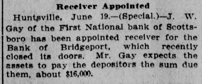 Receiver Appointed Huntsville, June 19.-(Special.)-J. W. Gay of the First National bank of Scottsboro has been appointed receiver for the Bank of Bridgeport, which recently closed its doors. Mr. Gay expects the assets to pay the depositors the sum due them, about $16,000.
