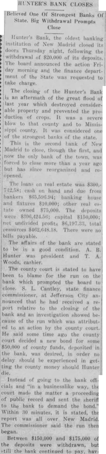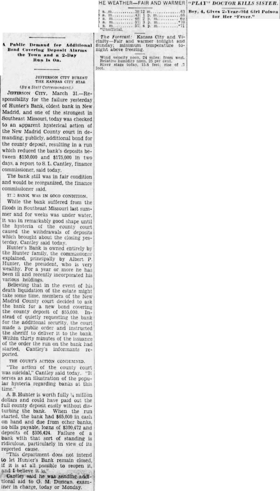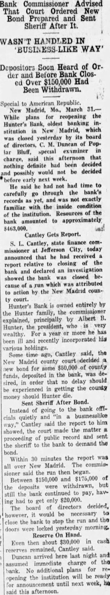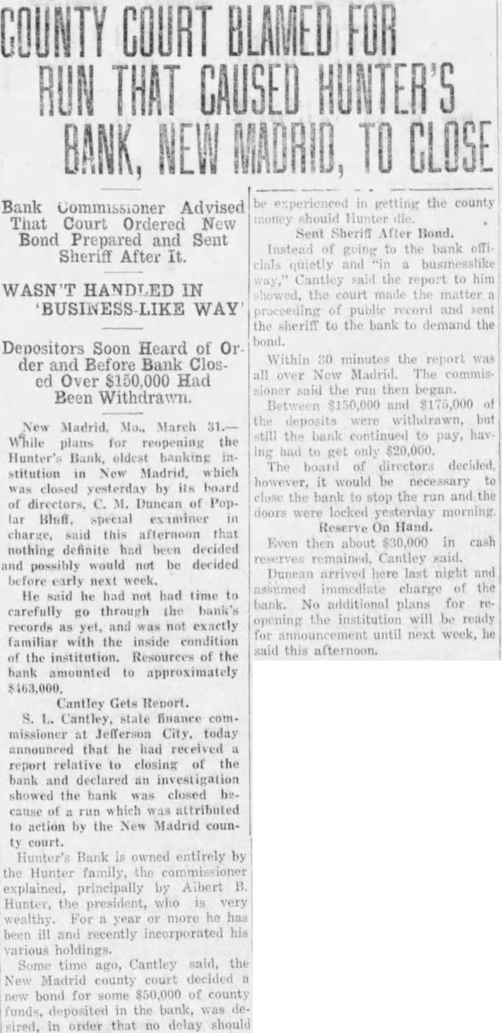 Jefferson City, March 31.-Responsibility for the failure yesterday of Hunter's Bank, oldest bank in New Madrid, and one of the strongest in Southeast Missouri, today was checked to an apparent hysterical action of the New Madrid county court in demanding, publicly, additional bond for the county deposit, resulting in a run which reduced the bank's deposits between $150,000 and $175,000 in two days, a report to S. L. Cantley, finance commissioner, said today. The bank still was in fair condition and would be reorganized, the finance commissioner said. The Bank Was In Good Condition. While the bank suffered from the floods in Southeast Missouri last summer and for weeks was under water, it was in remarkably good shape until the hysteria of the county court caused the withdrawals of deposits which brought about the closing yesterday, Cantley said today. Hunter's Bank is owned entirely by the Hunter family. the commissioner explained, principally by Albert P. Hunter. the president, who is very wealthy. For a year or more he has been ill and recently incorporated his various holdings. Believing that in the event of his death liquidation of the estate might take some time, members of the New Madrid county court decided to ask the bank for a new bond covering the county deposit of $55,000. Instead of quietly requesting the bank for the additional security. the court made a public order and instructed the sheriff to deliver it to the bank. Within 30 minutes of the issuance of the order the run on the bank had started, Cantley's informants reported. The Court's Action Condemned. "The action of the county court was suicidal." Cantley said today. "Tt serves as an illustration of the popular hysteria regarding banks at this time."