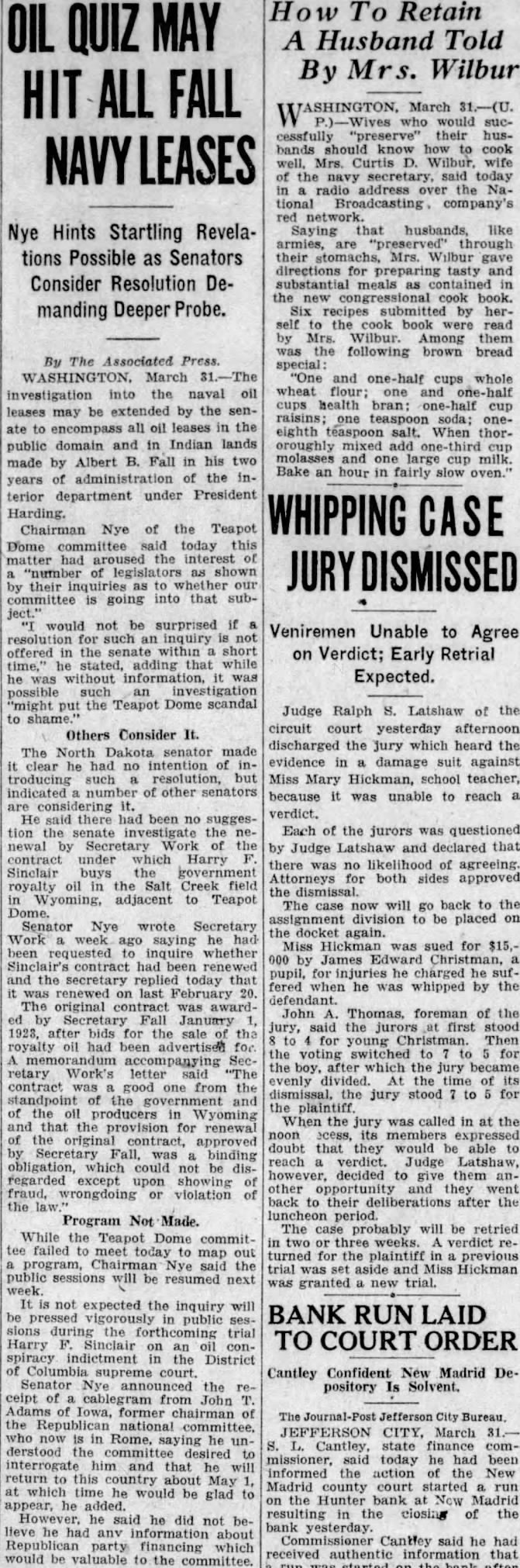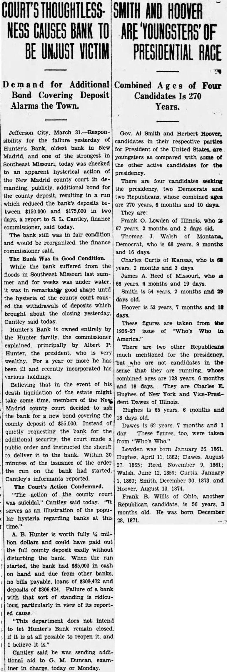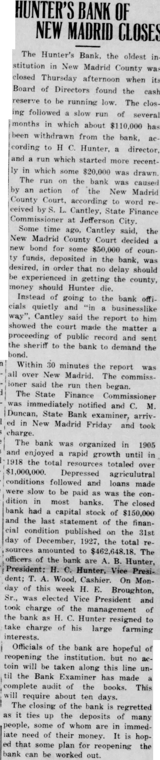 Jefferson City, March 31.-Responsibility for the failure yesterday of Hunter's Bank, oldest bank in New Madrid, and one of the strongest in Southeast Missouri, today was checked to an apparent hysterical action of the New Madrid county court in demanding, publicly, additional bond for the county deposit, resulting in a run which reduced the bank's deposits between $150,000 and $175,000 in two days, a report to S. L. Cantley, finance commissioner, said today. The bank still was in fair condition and would be reorganized, the finance commissioner said. The Bank Was In Good Condition. While the bank suffered from the floods in Southeast Missouri last summer and for weeks was under water, it was in remarkably good shape until the hysteria of the county court caused the withdrawals of deposits which brought about the closing yesterday, Cantley said today. Hunter's Bank is owned entirely by the Hunter family. the commissioner explained, principally by Albert P. Hunter. the president, who is very wealthy. For a year or more he has been ill and recently incorporated his various holdings. Believing that in the event of his death liquidation of the estate might take some time, members of the New Madrid county court decided to ask the bank for a new bond covering the county deposit of $55,000. Instead of quietly requesting the bank for the additional security. the court made a public order and instructed the sheriff to deliver it to the bank. Within 30 minutes of the issuance of the order the run on the bank had started, Cantley's informants reported. The Court's Action Condemned. "The action of the county court was suicidal." Cantley said today. "Tt serves as an illustration of the popular hysteria regarding banks at this time."