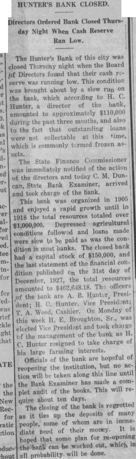 A. B. Hunter is worth fully % million dollars and could have paid out the full county deposit easily without disturbing the bank. When the run started, the bank had $65,000 in cash on hand and due from other banks, no bills payable, loans of $300.472 and deposits of $306,424. Failure of a bank with that sort of standing is ridiculous, particularly in view of its reported cause. "This department does not intend to let Hunter's Bank remain closed. if it is at all possible to reopen it. and I believe it is." Cantley said he was sending additional aid to G. M. Duncan, examiner in charge, today or Monday.