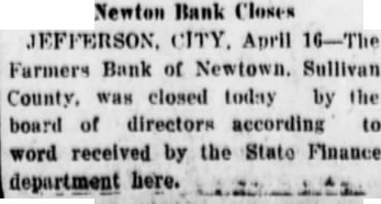 Article (Macon Chronicle-Herald, 1926-04-16) states the Farmers Bank of Newtown, Sullivan County, was closed today by the board of directors. No run or reopening mentioned. Closure appears to be a board-ordered suspension/closure (voluntary action), so classified as suspension leading to permanent closure.