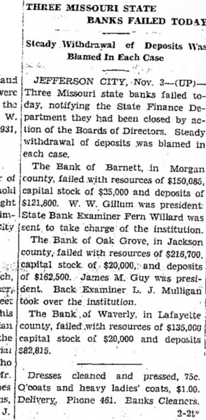 THREE MISSOURI STATE BANKS FAILED TODAY Steady Withdrawal of Deposits Was Blamed In Each Case JEFFERSON CITY, Nov. 3-(UP)Three Missouri state banks failed today, notifying the State Finance Department they had been closed by action of the Boards of Directors. Steady withdrawal of deposits was blamed in each case. The Bank of Barnett, in Morgan county, failed with resources of $150,085, capital stock of $25,000 and deposits of $121,800. W. W. Gillum was president State Bank Examiner Fern Willard was (sent to take charge of the institution. The Bank of Oak Grove, in Jackson county, failed with resources of $216,700. capital stock of $20,000, and deposits of $162,500. James M. Guy was president. Back Examiner L. J. Mulligan took over the institution. The Bank of Waverly. in Lafayette county, failed with resources of $135,000 capital stock of $20,000 and deposits $82,815. Dresses cleaned and pressed, 75c. O'coats and heavy ladies' coats, $1.00. Delivery. Phone 461. Banks Cleaners.