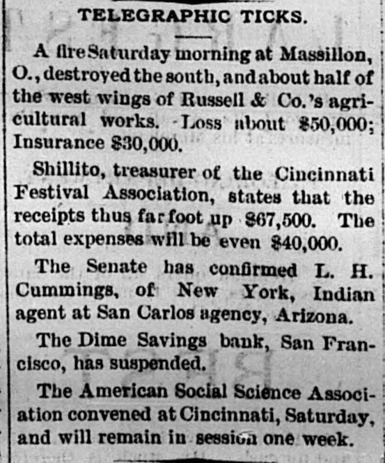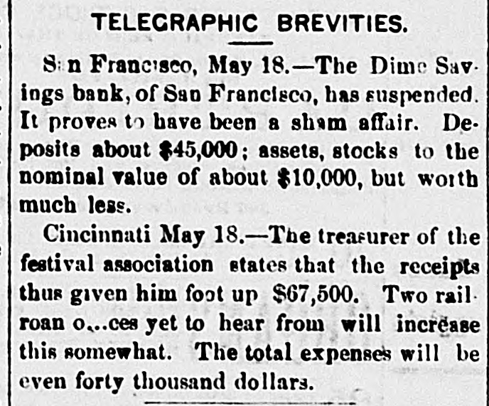 The Dime Savings Bank of San Francisco has suspended, with deposits amounting to about $45,000, and assets nominal. It turns out to have been a sham affair, not regularly incorporated, and its depositors were principally children. Joseph Davis & Co., a pawnbroking firm, were at the bottom of the swindle.