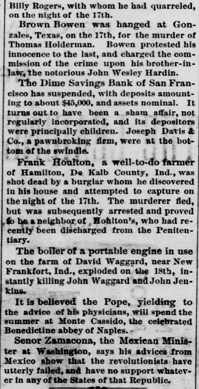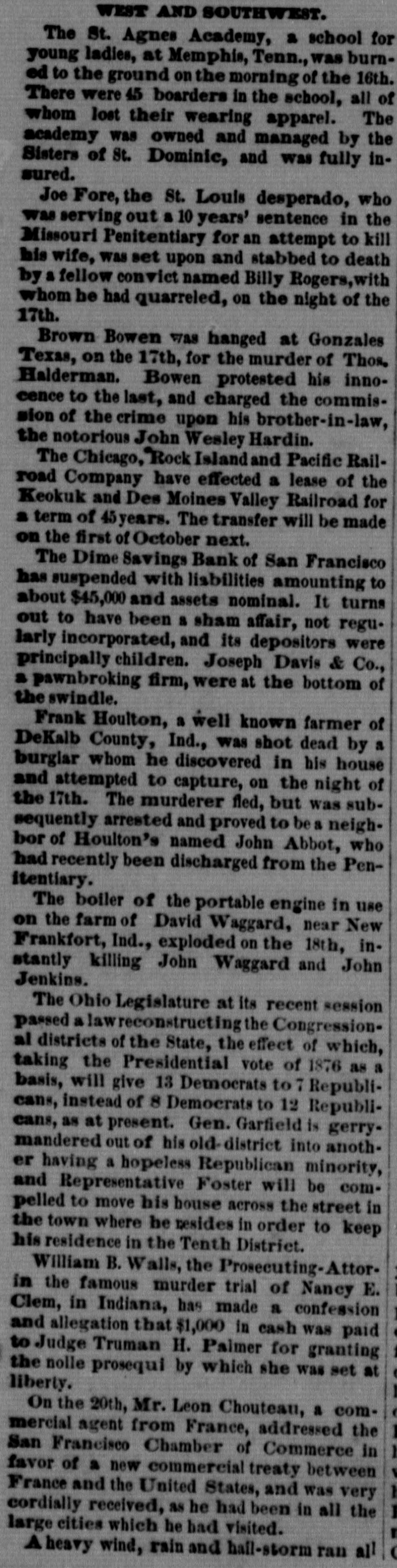 Brown Bowen was hanged at Gonzales, Texas, on the 17th, for the murder of Thomas Holderman. Bowen protested his innocence to the last, and charged the commission of the crime upon his brother-in-law, the notorious John Wesley Hardin.