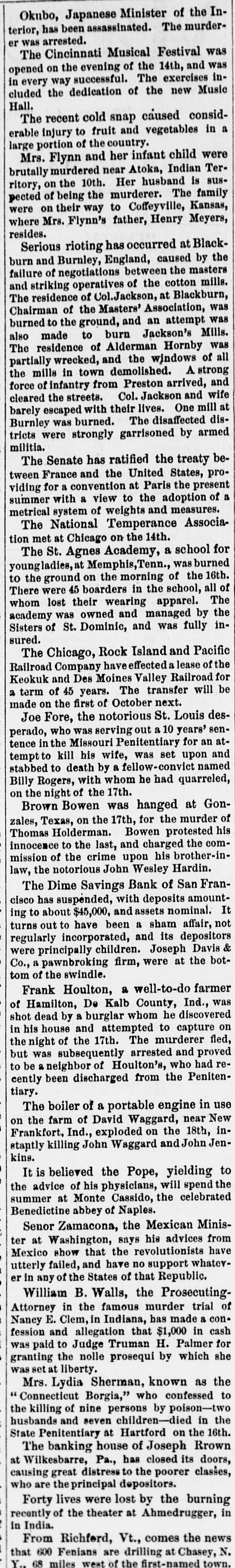 Mrs. Flynn and her infant child were brutally murdered near Atoka, Indian Territory, on the 10th. Her husband is suspected of being the murderer. The family were on their way to Coffeyville, Kansas, where Mrs. Flynn's father, Henry Meyers, resides.