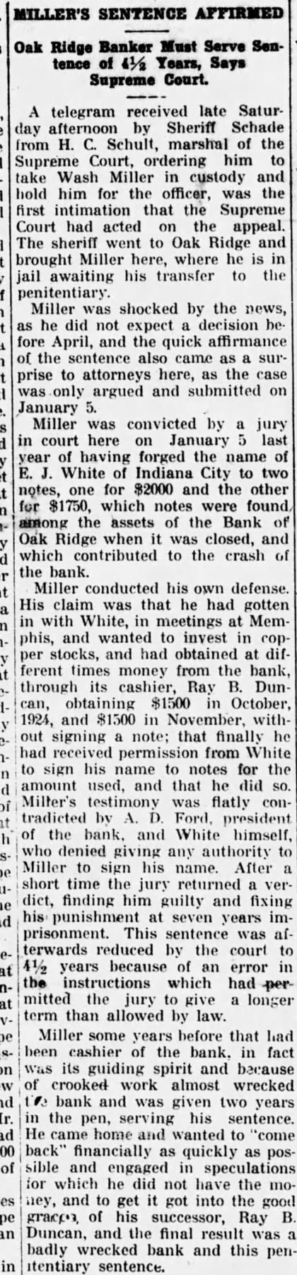 Oak Ridge Banker Serve tence of Years, Says Supreme Court. A telegram received late Saturday afternoon by Sheriff Schade from H. Schult, marshal of the Supreme Court, ordering him to take Wash Miller in custody and hold him for the officer, was the first intimation that the Supreme Court had acted on the appeal. The sheriff went to Oak Ridge and brought Miller here, where he is in awaiting his transfer to the penitentiary. Miller was shocked by the news, as he did not expect decision fore April, and the quick affirmance of the sentence also came as surprise to attorneys here, as the case was only argued and submitted on January Miller was convicted by jury in court here on January last year of having forged the name of White of Indiana City to two notes, one for $2000 and the other for $1750, which notes were among the assets of the Bank of Oak Ridge when it was closed, and which contributed to the crash the bank. Miller conducted his own defense. His claim was that he had gotten in with White, in meetings at Memphis, and wanted to invest in copstocks, and had obtained at different times money from the bank, through its cashier, Ray Duncan, obtaining $1500 in October, and $1500 in November, without signing that finally he had received permission from White to sign his name to notes for the amount used, and that he did Milter's testimony was flatly contradicted by Ford. president of the and White himself, who denied any authority to Miller to sign his name. After short time the jury returned dict, finding him guilty and fixing punishment at seven years prisonment. This sentence was terwards reduced by the court years because of an error in the instructions which had mitted the jury to give longer term than allowed by law. Miller some years before that had been cashier of the bank, in fact was its guiding spirit and because of crooked work almost wrecked bank and was given two years in the pen, his sentence. He came home and wanted to back" financially quickly as possible and engaged in which he did not have the money, and to get got into the good grace of his successor, Ray Duncan, and the final result badly wrecked bank and this itentiary sentence.