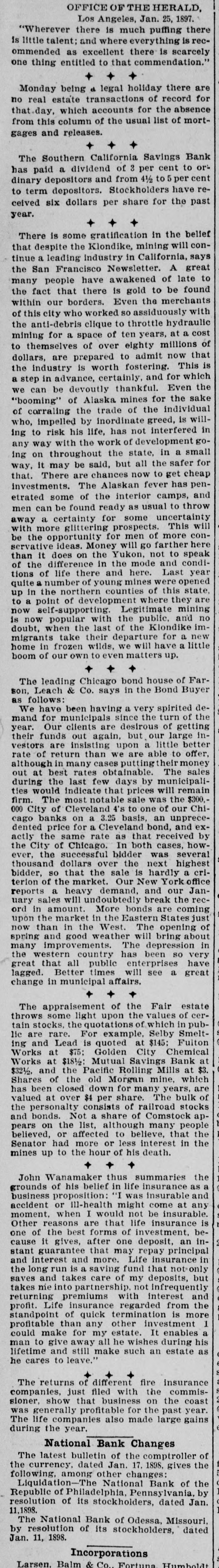 OFFICE OF THE HERALD, Los Angeles, Jan. 25, 1897. "Wherever there is much puffing there is little talent; and where everything is recommended as excellent there is scarcely one thing entitled to that commendation." + + + Monday being a legal holiday there are no real estate transactions of record for that.day. which accounts for the absence from this column of the usual list of mortgages and releases. + The Southern California Savings Bank has paid a dividend of 3 per cent to ordinary depositors and from 41/2 to 5 to term depositors. Stockholders have recelved six dollars per share for the past year. + + + There is some gratification in the belief that despite the Klondike, mining will continue a leading industry in California, says the San Francisco Newsletter. A great many people have awakened of late to the fact that there is gold to be found within our borders. Even the merchants of this city who worked so assiduously with the anti-debris clique to throttle hydraulic mining for a space of ten years, at a cost to themselves of over eighty millions of dollars, are prepared to admit now that the industry is worth fostering. This is a step in advance, certainly, and for which we can be devoutly thankful. Even the "booming" of Alaska mines for the sake of corraling the trade of the individual who, impelled by inordinate greed, is willing to risk his life, has not interfered in any way with the work of development going on throughout the state, in a small way, it may be said, but all the safer for that. There are chances now to get cheap investments. The Alaskan fever has penetrated some of the interior camps, and men can be found ready as usual to throw away a certainty for some uncertainty with more glittering prospects. This will be the opportunity for men of more conservative ideas. Money will go farther here than it does on the Yukon, not to speak of the difference in the mode and conditions of life there and here. Last year quite a number of young mines were opened in the northern counties of this state, up to a point of development where they are now self-supporting. Legitimate mining is now popular with the public. and no doubt, when the last of the Klondike immigrants take their departure for a new home in frozen wilds, we will have a little boom of our own to even matters up. + + + The leading Chicago bond house of Farson, Leach & Co. says in the Bond Buyer as follows: We have been having a very spirited demand for municipals since the turn of the year. Our clients are desirous of getting their funds out again. but our large investors are insisting upon a little better offer, rate of return than we are able to although in many cases putting money out at best rates obtainable. The sales during the last few days by municipalities would indicate that prices will remain firm. The most notable sale was the $300. 000 City of Cleveland 4's to one of our Chicago banks on a 3.25 basis, an unprecedented price for a Cleveland bond, and actly the same rate as that received by the City of Chicago In both cases, however, the successful bidder was several thousand dollars over the next highest bidder, so that the sale is hardly a criterion of the market. Our New York office reports a heavy demand, and our January sales will undoubtedly break the record in amount. More bonds are coming upon the market in the Eastern States now than in the West. The opening of spring and good weather will bring about many improvements. The depression in the western country has been so very great that all public enterprises have lagged. Better times will see a great change in municipal affairs. The appraisement of the Fair estate throws some light upon the values of certain stocks. the quotations of which in public are rare. For example, Selby Smelting and Lead is quoted at $145: Fulton Works at $75: Golden City Chemical Works at $18 1/2: Mutual Savings Bank at $321/2. and the Pacific Rolling Mills at $3. Shares of the old Morgan mine, which has been closed down for many years, are valued at over $4 per share. The bulk of the personalty consists of railroad stocks and bonds. Not a share of Comstock appears on the list, although many people believed, or affected to believe, that the Senator had more or less interest in the mines up to the hour of his death. + + + John Wanamaker thus summaries the grounds of his belief in life insurance business proposition: "I was insurable and accident or ill-health might come at any moment, when I would not be insurable. Other reasons are that life insurance is one of the best forms of investment, because it gives, after one deposit, an instant guarantee that may repay principal and interest and more. Life insurance in the long run is a saving fund that not-only saves and takes care of my deposits, but takes nie into partnership. not infrequently returning premiums with interest and profit. Life insurance regarded from the standpoint of quick termination is more profitable than any other investment 1 could make for my estate. It enables a man to give away all he wishes during his lifetime and still make such an estate as he cares to leave." + The returns of different fire insurance companies, just filed with the commissioner, show that business on the coast was generally profitable for the past year The life companies also made large gains during the year. National Bank Changes The latest bulletin of the comptroller of the currency, dated Jan. 17. 1898, gives the following, among other changes: National Bank of the of by Republic Liguldation-The Philadelphia, Pennsylvania, dated Jan. resolution of its stockholders, 11.1898. The National Bank of Odessa, Missouri, by resolution of its stockholders, dated Jan. 11, 1898. Incorporations Larsen, Balm & Co., Fortuna Humboldt