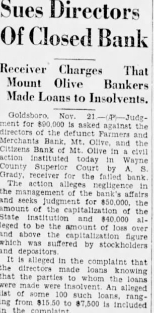 Sues Directors Closed Bank Receiver Charges That Mount Olive Bankers Made Loans to Insolvents. for asked against directors defunct Farmers and Merchants Bank Mt. Olive and Citizens Bank Mt. Olive in civil action instituted today in Wayne County Superior Court Grady, receiver for the failed bank The action alleges negligence in the management the bank's and seeks judgment for $50,000. the the the State and $40,000 alleged to be the amount of loss over and above the capitalization figure which suffered by stockholders and depositors alleged in the complaint that the directors loans knowing that the whom the loans were An alleged list of 100 such loans, ranging from to $7,500 is included in the complaint