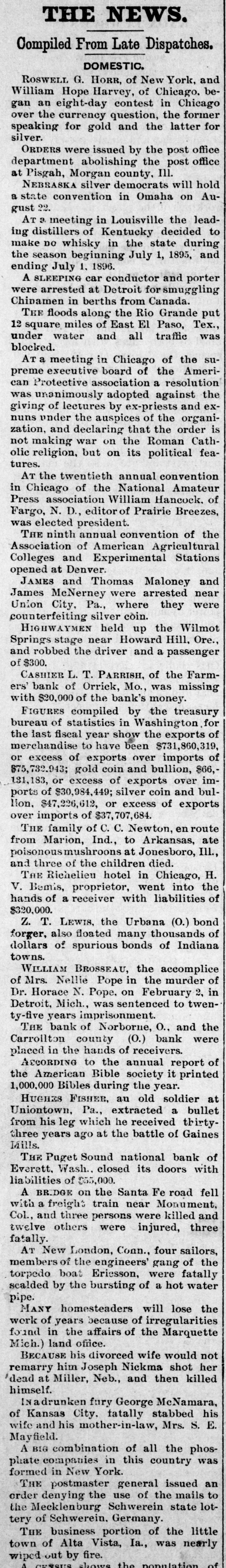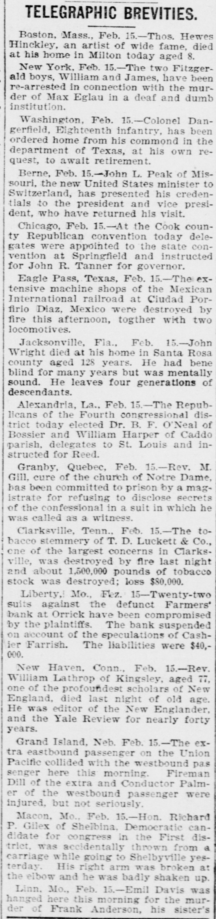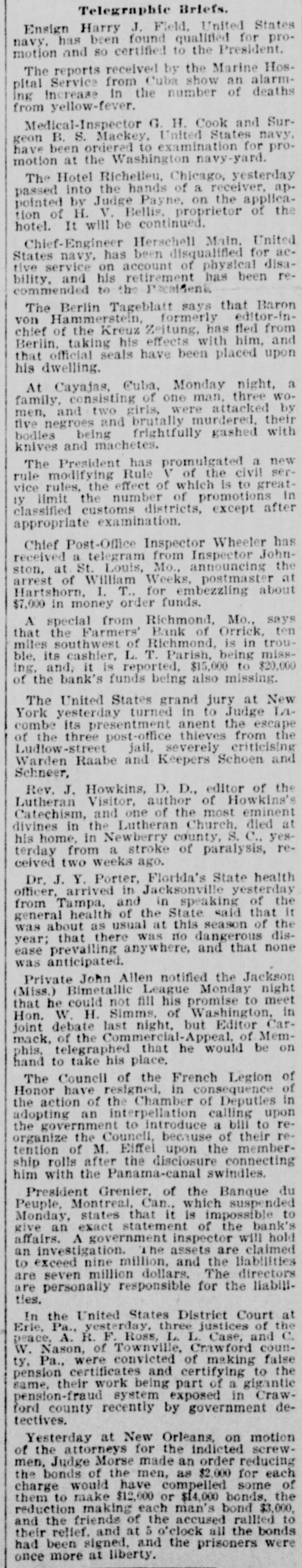 Telegraphic Briefs. Ensign Harry J. Field, United State navy, has been found qualified for pro motion and so certified to the President. The reports received by the Marine Hos pital Service from Cuba show an alarm ing increase in the number of death from yellow-fever. Medical-Inspector G. H. Cook and Sur geon B. S. Mackey, United States navy have been ordered to examination for pro motion at the Washington navy-yard. The Hotel Richelieu, Chicago, yesterda passed into the hands of a receiver, ap pointed by Judge Payne, on the applica tion of H. V. Bellis. proprietor of th hotel. It will be continued. Chief-Engineer Herschell Main. United States navy, has been disqualified for ac tive service on account of physical disa bility, and his retirement has been re commended to the President. The Berlin Tageblatt says that Baro von Hammerstein, formerly editor-in chief of the Kreuz Zeitung, has fled from Berlin, taking his effects with him, and that official seals have been placed upoi his dwelling. At Cayajas, Cuba, Monday night, : family, consisting of one man, three wo men, and two girls, were attacked b) five negroes and brutally murdered, thei bodies being frightfully gashed with knives and machetes. The President has promulgated a nev rule modifying Rule V of the civil ser vice rules, the effect of which is to great 1y limit the number of promotions 11 classified customs districts, except afte appropriate examination. Chief Post-Office Inspector Wheeler has received a telegram from Inspector John ston, at St. Louis, Mo., announcing th arrest of William Weeks, postmaster a Hartshorn, I. T., for embezzling abou $7,000 in money order funds. A special from Richmond, Mo., say that the Farmers' Bank of Orrick, ter miles southwest of Richmond, is in trou ble, its cashier, L. T. Parish, being miss ing, and, it is reported, $15,000 to $20.00 of the bank's funds being also missing. The United States grand jury at New York yesterday turned in to Judge La combe its presentment anent the escap of the three post-office thieves from the Ludlow-street jail, severely criticising Warden Raabe and Keepers Schoen and Schneer, Rev. J. Howkins, D. D., editor of th Lutheran Visitor, author of Howkins' Catechism, and one of the most eminen divines in the Lutheran Church, died a his home, in Newberry county, S. C., yes terday from a stroke of paralysis, re ceived two weeks ago, Dr. J. Y. Porter, Florida's State healt! officer, arrived in Jacksonville yesterda from Tampa, and in speaking of the general health of the State said that I was about as usual at this season of the year; that there was no dangerous dis ease prevailing anywhere, and that non was anticipated. Private John Allen notified the Jackson (Miss.) Bimetallic League Monday nigh that he could not fill his promise to mee Hon. W. H. Simms, of Washington, it joint debate last night, but Editor Car mack, of the Commercial-Appeal, of Mem phis, telegraphed that he would be or hand to take his place, The Council of the French Legion o Honor have resigned, in consequence o the action of the Chamber of Deputies in adopting an interpellation calling upor the government to introduce a bill to re organize the Council, because of their re tention of M. Eiffel upon the member ship rolls after the disclosure connecting him with the Panama-canal swindles. Si the Denaue 3.