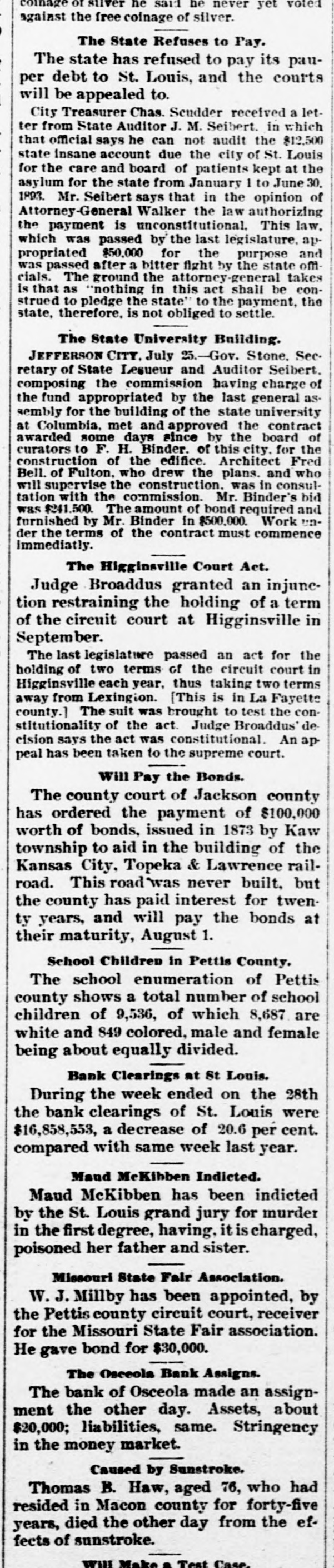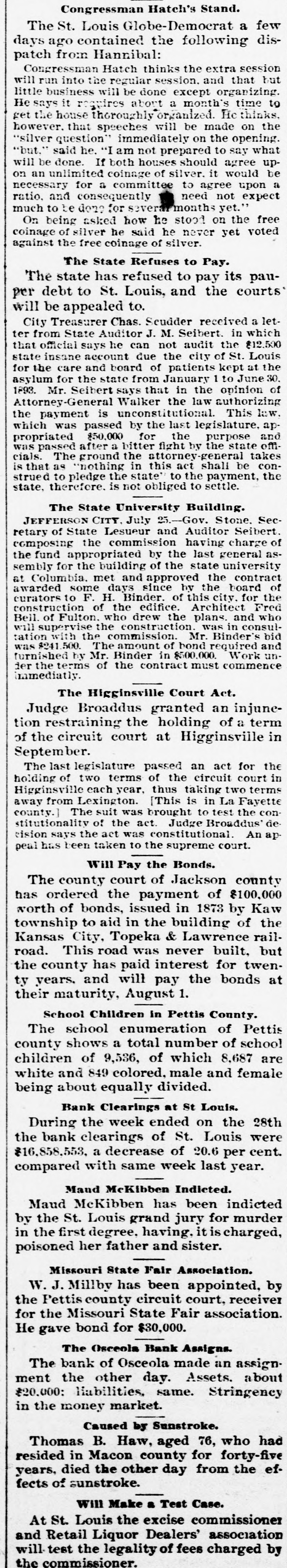 Congressman Hatch thinks the extra session will run into the regular session. and that but little business will be done except organizing. He says it requires about a month's time to get the house thoroughly organized. Hc thinks. however. that speeches will be made on the "silver question" immediately on the opening. "but." said he. "I am not prepared to say what will be done. If both houses should agree upon an unlimited coinage of silver. it would be necessary for a committee to agree upon a need not expect ratio. and consequently much to be done for severa months yet." On being asked how he stood on the free coinage of silver he said he never yet voted against the free coinage of silver. The State Refuses to Pay. The state has refused to pay its pauper debt to St. Louis, and the courts' will be appealed to. City Treasurer Chas. Scudder received a letter from State Auditor J. M. Seibert. in which that official says he can not audit the $12.500 state insane account due the city of St. Louis for the care and board of patients kept at the asylum for the state from January 1 to June 30. 1893. Mr. Seibert says that in the opinion of Attorney-General Walker the law authorizing the payment is unconstitutional This law. which was passed by the last legislature. appropriated $50,000 for the purpose and was passed after a bitter fight by the state officials. The ground the attorney-general takes is that as "nothing in this act shall be construed to pledge the state" to the payment, the state, therefore. is not obliged to settle. The State University Building. JEFFERSON CITY. July 25.-Gov. Stone. Secretary of State Lesueur and Auditor Seibert. composing the commission having charge of the fund appropriated by the last general assembly for the building of the state university at Columbia. met and approved the contract awarded some days since by the board of curators to F. H. Binder. of this city. for the construction of the edifice. Architect Fred Bell. of Fulton. who drew the plans. and who will supervise the construction. was in consultation with the commission. Mr. Binder bid was $241 500. The amount of bond required and furnished by Mr. Binder in $500,000. Work under the terms of the contract must commence Immediatly. The Higginsville Court Act. Judge Broaddus granted an injunetion restraining the holding of a term of the circuit court at Higginsville in September. The last legislature passed an act for the holding of two terms of the circuit court in Higginsville each year, thus taking two terms away from Lexington. [This is in La Fayette county.] The suit was brought to test the constitutionality of the act. Judge Broaddus' decision says the act was constitutional. An ap. peal has been taken to the supreme court. Will Pay the Bonds. The county court of Jackson county has ordered the payment of $100,000 worth of bonds, issued in 1873 by Kaw township to aid in the building of the Kansas City, Topeka & Lawrence railroad. This road was never built, but the county has paid interest for twenty years. and will pay the bonds at their maturity, August 1. School Children in Pettis County. The school enumeration of Pettis county shows a total number of school children of 9,536, of which 8,687 are white and 849 colored, male and female being about equally divided. Bank Clearings at St Louis. During the week ended on the 28th the bank clearings of St. Louis were $16,858,553, a decrease of 20.6 per cent. compared with same week last year. Mand McKibben Indicted. Maud McKibben has been indicted by the St. Louis grand jury for murder in the first degree, having, it is charged, poisoned her father and sister. Missouri State Fair Association. W. J. Millby has been appointed, by the Pettis county circuit court. receiver for the Missouri State Fair association. He gave bond for $30,000. The Osceola Bank Assigns. The bank of Osceola made an assignment the other day. Assets. about $20,000: liabilities, same. Stringency in the money market. Caused by Sunstroke. Thomas B. Haw, aged 76, who had resided in Macon county for forty-five years, died the other day from the effects of sunstroke. Will Make a Test Case. At St. Louis the excise commissioner and Retail Liquor Dealers' association will test the legality of fees charged by the commissioner.