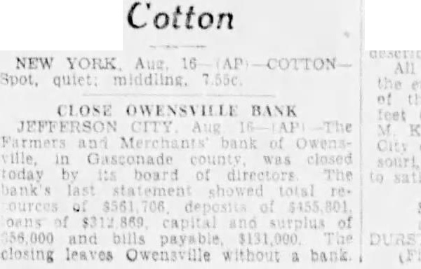 Heavy withdrawals assigned the reason all the closings. The four banks Owensville bank, Owensville, Gasconade county...