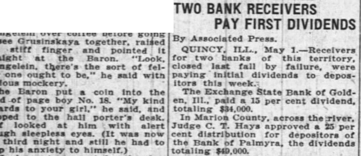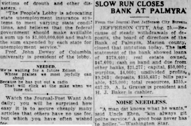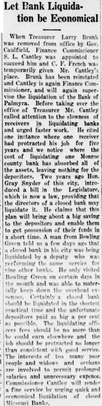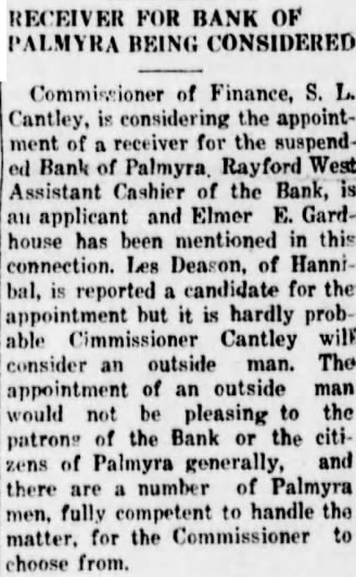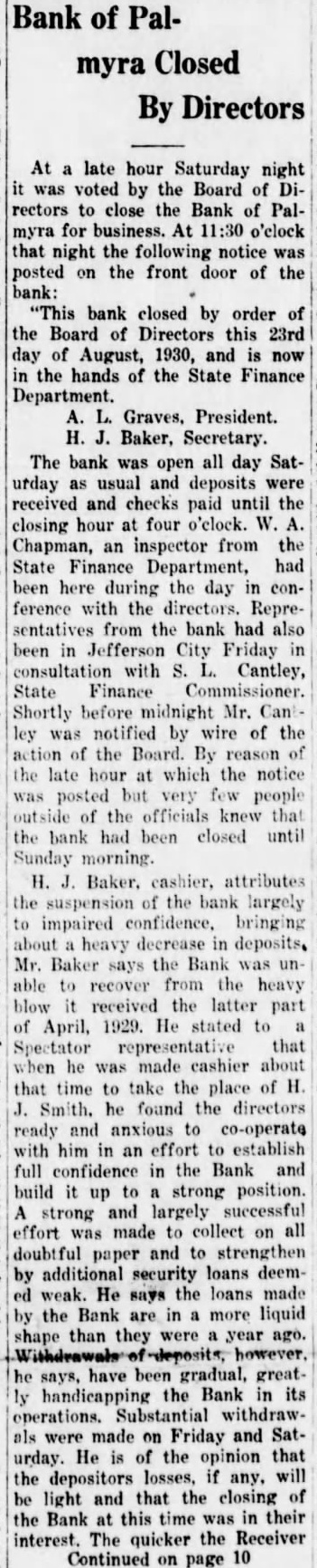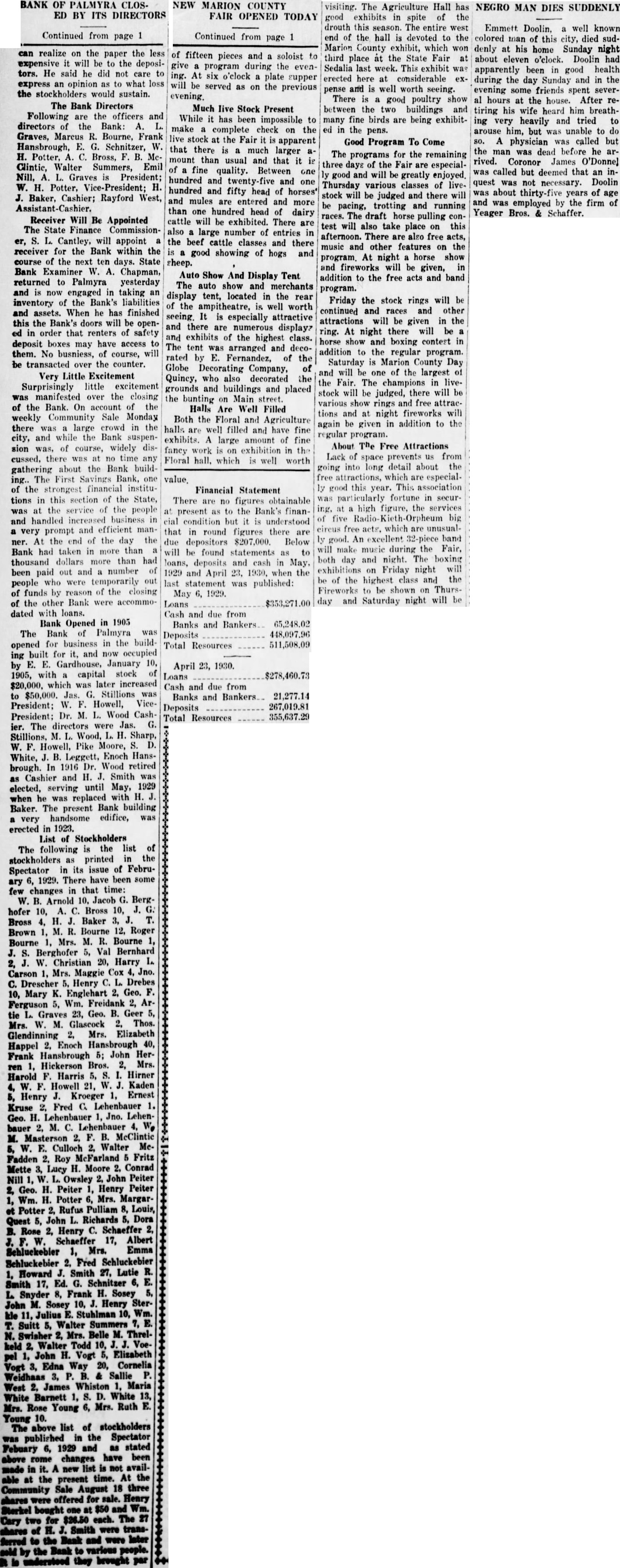 Continued from page 1 can realize on the paper the less expensive it will be to the depositors. He said he did not care to express an opinion as to what loss the stockholders would sustain. The Bank Directors Following are the officers and directors of the Bank: A. L. Graves, Marcus R. Bourne, Frank Hansbrough, E. G. Schnitzer, W. H. Potter, A. C. Bross, F. B. McClintic, Walter Summers, Emil Nill, A. L. Graves is President; W. H. Potter, Vice-President; H. J. Baker, Cashier; Rayford West, Assistant-Cashier. Receiver Will Be Appointed The State Finance Commissioner, S. L. Cantley, will appoint a receiver for the Bank within the course of the next ten days. State Bank Examiner W. A. Chapman, returned to Palmyra yesterday and is now engaged in taking an inventory of the Bank's liabilities and assets. When he has finished this the Bank's doors will be opened in order that renters of safety deposit boxes may have access to them. No busniess, of course, will be transacted over the counter. Very Little Excitement Surprisingly little excitement was manifested over the closing of the Bank. On account of the weekly Community Sale Monday there was a large crowd in the city, and while the Bank suspension was, of course, widely discussed, there was at no time any gathering about the Bank building.. The First Savings Bank, one of the strongest financial institutions in this section of the State, was at the service of the people and handled increased business in a very prompt and efficient manner. At the end of the day the Bank had taken in more than a thousand dollars more than had been paid out and a number of people who were temporarily out of funds by reason of the closing of the other Bank were accommodated with loans. Bank Opened in 1905 The Bank of Palmyra was opened for business in the building built for it. and now occupied by E. E. Gardhouse, January 10, 1905, with a capital stock of $20,000, which was later increased to $50,000. Jas. G. Stillions was President; W. F. Howell, VicePresident: Dr. M. L. Wood Cashier. The directors were Jas. G. Stillions, M. L. Wood, L. H. Sharp, W. F. Howell, Pike Moore, S. D. White, J. B. Leggett, Enoch Hansbrough. In 1916 Dr. Wood retired as Cashier and H. J. Smith was elected, serving until May, 1929 when he was replaced with H. J. Baker. The present Bank building a very handsome edifice, was erected in 1923. List of Stockholders The following is the list of stockholders as printed in the Spectator in its issue of February 6, 1929. There have been some few changes in that time: W. B. Arnold 10. Jacob G. Berghofer 10, A. C. Bross 10, J. G. Bross 4, H. J. Baker 3, J. T. Brown 1, M. R. Bourne 12, Roger Bourne 1, Mrs. M. R. Bourne 1, J. S. Berghofer 5, Val Bernhard 2, J. W. Christian 20, Harry L. Carson 1, Mrs. Maggie Cox 4, Jno. C. Drescher 5, Henry C. L. Drebes 10, Mary K. Englehart 2. Geo. F. Ferguson 5, Wm. Freidank 2, Artie L. Graves 23, Geo. B. Geer 5, Mrs. W. M. Glascock 2. Thos. Glendinning 2. Mrs. Elizabeth Happel 2. Enoch Hansbrough 40, Frank Hansbrough 5; John Herren 1, Hickerson Bros. 2, Mrs. Harold F. Harris 5, S. I. Hirner 4, W. F. Howell 21, W. J. Kaden 5, Henry J. Kroeger 1, Ernest Kruse 2. Fred C. Lehenbauer 1. Geo. H. Lehenbauer 1, Jno. Lehenbauer 2, M. C. Lehenbauer 4, W, M. Masterson 2. F. B. McClintic 5, W. E. Culloch 2, Walter McFadden 2. Roy McFarland 5 Fritz Mette 3, Lucy H. Moore 2. Conrad Nill 1, W. L. Owsley 2, John Peiter 2, Geo. H. Peiter 1, Henry Peiter 1, Wm. H. Potter 6, Mrs. Margaret Potter 2, Rufus Pulliam 8, Louis, Quest 5, John L. Richards 5, Dora B. Rose 2, Henry C. Schaeffer 2, J. F. W. Schaeffer 17, Albert Schluckebier 1, Mrs. Emma Schluckebier 2. Fred Schluckebier 1, Howard J. Smith 27, Lutie R. Smith 17, Ed. G. Schnitzer 6, E. L Snyder 8, Frank H. Sosey John M. Sosey 10, J. Henry Sterkle 11, Julius E. Stuhlman 10, Wm. T. Suitt 5, Walter Summers 7, E. N. Swisher 2, Mrs. Belle M. Threlkeld 2. Walter Todd 10, J. J. Voepel 1, John H. Vogt 5, Elizabeth Vogt 3, Edna Way 20, Cornelia Weidhaas 3, P. B. & Sallie P. West 2, James Whiston 1, Maria White Barnett 1, S. D. White 13, Mrs. Rose Young 6, Mrs. Ruth E. Young 10. The above list of stockholders was published in the Spectator Febuary 6, 1929 and as stated above some changes have been made in it. A new list is not available at the present time. At the Community Sale August 18 three shares were offered for sale. Henry Sterkel bought one at $50 and Wm. Cary two for $26.50 each. The 27 shares of H. J. Smith were transferred to the Bank and were later sold by the Bank to various people. R is understood they brought par