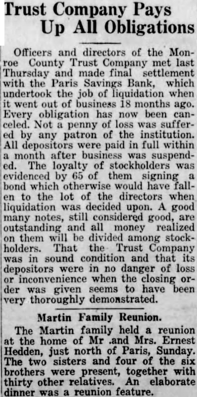 Trust Company Pays Up All Obligations Officers and directors of the MonCounty Trust Company met last Thursday and made final settlement with the Paris Savings Bank, which the of when went out of months ago. Every has now been Not penny was sufferpatron of the institution. any All were paid full within month after suspendThe loyalty of stockholders evidenced of them signing bond which otherwise would have the lot the directors when liquidation was decided upon. good many notes, still considered good, outstanding and all money realized them divided among stockholders. That Trust was in sound condition and that its were in no danger of when the was given seems thoroughly demonstrated. Martin Family Reunion. The Martin family held reunion the home Mr and Mrs. Ernest Hedden, just north Paris, Sunday. The sisters and four brothers were present, together other relatives. An elaborate dinner reunion feature.