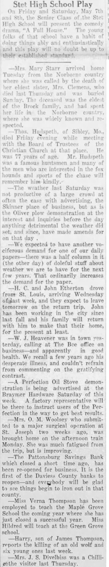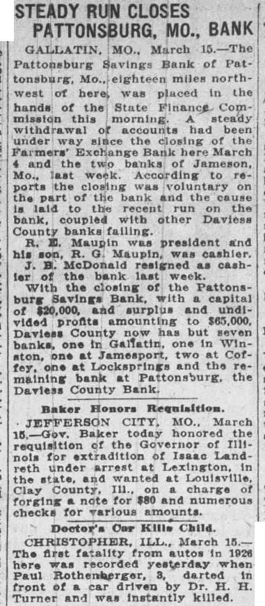 STEADY RUN CLOSES PATTONSBURG, MO., BANK GALLATIN, MO., March 15.-The Pattonsburg Savings Bank of Pattonsburg, Mo., eighteen miles northwest of here, was placed in the hands of the State Finance. Commission morning. steady withdrawal of accounts had been under the of the Farmers' Exchange Bank March and the two banks Jameson, Mo., week. According to ports the closing was voluntary on the part of the bank and is laid to the recent run on the bank, other Daviess County banks R. E. Maupin was president and his son, R. Maupin, was cashier. B. McDonald resigned as cashfor of the bank last With the closing the PattonsSavings Bank, with capital of $20,000, surplus and undivided profits amounting $65, Daviess County now has but seven banks, one in Gallatin, in Winston, one at Jamesport, two at Cofone at Locksprings and the remaining bank at the Daviess County Bank Baker Requisition CITY, MO., March 15,-Gov. today the requisition of the Governor of IIII. nois for of Isaac Land reth under arrest at Lexington, the state, and wanted at Louisville, Clay County, charge of forging for $80 and checks for amounts. ILL., March 15.The first fatality from autos in 1926 here was recorded yesterday when Paul Rothenberger, darted front of car driven by Dr. H. H. Turner and was instantly killed.