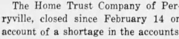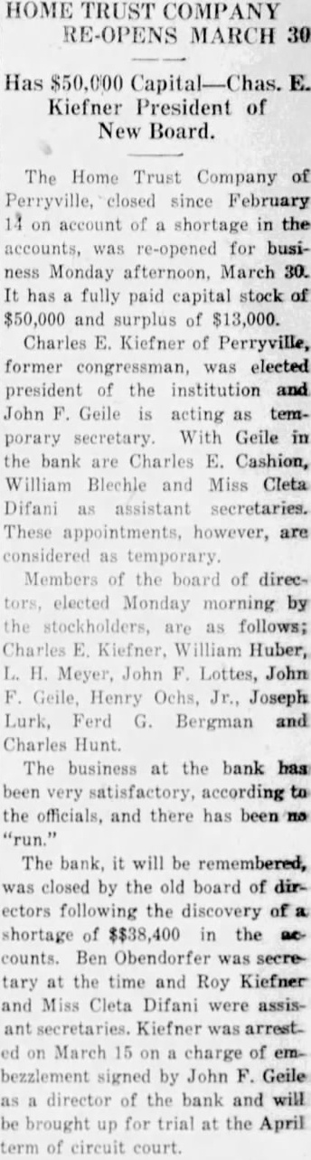 HOME TRUST COMPANY RE-OPENS MARCH 30 Kiefner President of New Board. The Home Trust Company of Perryville, closed since February on account of shortage in the accounts, was re-opened for business Monday afternoon. March 30. has fully paid capital stock of $50,000 and surplus of $13,000. Charles E. Kiefner of Perryville, former congressman, was elected president the institution and John Geile acting as temporary secretary. With Geile in the bank are Charles E. Cashion, William Blechle and Miss Cleta Difani assistant secretaries. These appointments, however, are considered temporary. Members of the board of direcelected Monday morning by the stockholders, are as follows; Charles William Huber, Meyer, John Lottes, John Geile, Henry Ochs, Jr., Joseph Lurk, Ferd Bergman and Charles Hunt. The business at the bank has been satisfactory, according the officials, and there has "run." The bank, it will be remembered, closed by the old board of directors following the discovery of shortage of $$38,400 in the counts. Ben Obendorfer was secreat the time and Roy Kiefner and Miss Cleta Difani were assisant secretaries. Kiefner arrestMarch 15 charge of bezzlement signed by John Geile director of the bank and will brought for trial at the April term of circuit court.