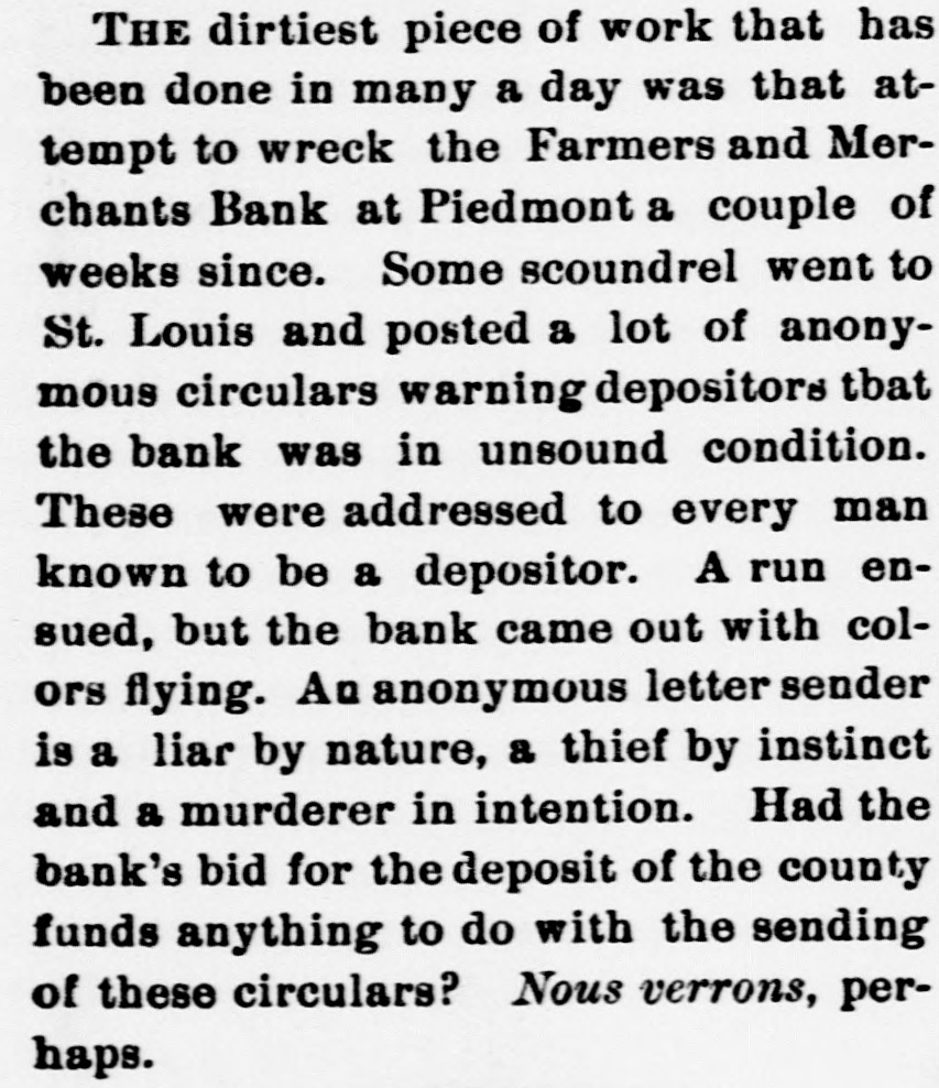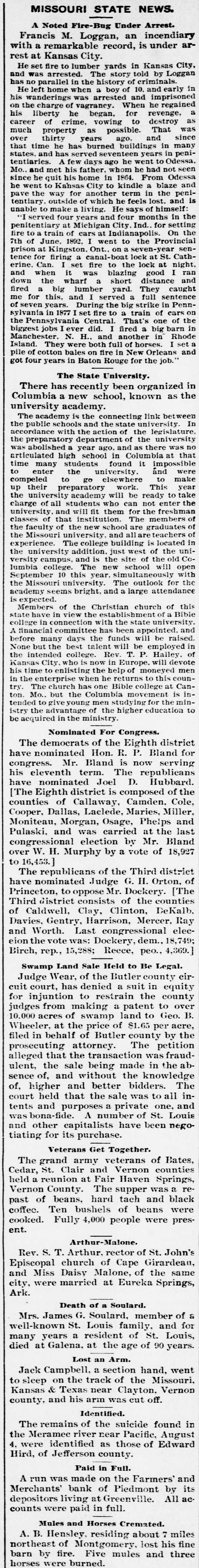# MISSOURI STATE NEWS. ## A Noted Fire-Bug Under Arrest. Francis M. Loggan, an incendiary with a remarkable record, is under arrest at Kansas City. He set fire to lumber yards in Kansas City, and was arrested. The story told by Loggan has no parallel in the history of criminals. He left home when a boy of 10, and early in his wanderings was arrested and imprisoned on the charge of vagrancy. When he regained his liberty he began, for revenge, a career of crime, vowing to destroy as much property as possible. That was over thirty years ago, and since that time he has burned buildings in many states, and has served seventeen years in penitentiaries. A few days ago he went to Odessa, Mo., and met his father, whom he had not seen since he quit his home in 1864. From Odessa he went to Kansas City to kindle a blaze and pave the way for another term in the penitentiary, outside of which he feels lost, and is unable to make a living. He says of himself: "I served four years and four months in the penitentiary at Michigan City, Ind., for setting fire to a train of cars at Indianapolis. On the 7th of June, 1892, I went to the Provincial prison at Kingston, Ont., on a seven-year sentence for firing a canal-boat lock at St. Catherine, Can. I set fire to the lock at night, and when it was blazing good I ran down the wharf a short distance and fired a big lumber yard. They caught me for this, and I served a full sentence of seven years. During the big strike in Pennsylvania in 1877 I set fire to a train of cars on the Pennsylvania Central. That's one of the biggest jobs I ever did. I fired a big barn in Manchester, N. H., and another in Rhode Island. They were both full of horses. I set a pile of cotton bales on fire in New Orleans and got four years in Baton Rouge for the job." ## The State University. There has recently been organized in Columbia a new school, known as the university academy. The academy is the connecting link between the public schools and the state university. In accordance with the action of the legislature, the preparatory department of the university was abolished a year ago, and as there was no articulated high school in Columbia at that time many students found it impossible to enter the university, and were compeled to go elsewhere to make up their preparatory work. This year the university academy will be ready to take charge of all students who can not enter the university, and will fit them for the freshman classes of that institution. The members of the faculty of the new school are graduates of the Missouri university, and all are teachers of experience. The college building is located in the university addition, just west of the university campus, and is the site of the old Columbia college. The new school will open September 10 this year, simultaneously with the Missouri university. The outlook for the academy seems bright, and a large attendance is expected. Members of the Christian church of this state have in view the establishment of a Bible college in connection with the state university. A financial committee has been appointed, and before many days the funds will be raised. None but the best talent will be employed in the intended college. Rev. T. P. Halley, of Kansas City, who is now in Europe, will devote his time to enlisting the help of moneyed men in the enterprise when he returns to this country. The church has one Bible college at Canton, Mo., but the Columbia movement is intended to give young men studying for the ministry the advantage of the higher education to be acquired in the ministry. ## Nominated For Congress. The democrats of the Eighth district have nominated Hon. R. P. Bland for congress. Mr. Bland is now serving his eleventh term. The republicans have nominated Joel D. Hubbard. [The Eighth district is composed of the counties of Callaway, Camden, Cole, Cooper, Dallas, Laclede, Maries, Miller, Moniteau, Morgan, Osage, Phelps and Pulaski, and was carried at the last congressional election by Mr. Bland over W. H. Murphy by a vote of 18,927 to 16,453.] The republicans of the Third district have nominated Judge G. H. Orton, of Princeton, to oppose Mr. Dockery. [The Third district consists of the counties of Caldwell, Clay, Clinton, DeKalb, Davies, Gentry, Harrison, Mercer, Ray and Worth. Last congressional election the vote was: Dockery, dem., 18,749; Birch, rep., 15,288; Reece, peo., 4,369.] ## Swamp Land Sale Held to Be Legal. Judge Wear, of the Butler county circuit court, has denied a suit in equity for injuntion to restrain the county judges from making a patent to over 10,000 acres of swamp land to Geo. B. Wheeler, at the price of $1.65 per acre, filed in behalf of Butler county by the prosecuting attorney. The petition alleged that the transaction was fraudulent, the sale being made in the absence of, and without the knowledge of, higher and better bidders. The court held that the sale was to all intents and purposes a private one, and was bona-fide. A number of St. Louis and other capitalists have been negotiating for its purchase. ## Veterans Get Together. The grand army veterans of Bates, Cedar, St. Clair and Vernon counties held a reunion at Fair Haven Springs, Vernon County. The supper was a repast of beans, hard tach and black coffee. Ten bushels of beans were cooked. Fully 4,000 people were present. ## Arthur-Malone. Rev. S. T. Arthur, rector of St. John's Episcopal church of Cape Girardeau, and Miss Daisy Malone, of the same city, were married at Eureka Springs, Ark. ## Death of a Soulard. Mrs. James G. Soulard, member of a well-known St. Louis family, and for many years a resident of St. Louis, died at Galena, at the age of 90 years. ## Lost an Arm. Jack Campbell, a section hand, went to sleep on the track of the Missouri, Kansas & Texas near Clayton, Vernon county, and his arm was cut off. ## Identified. The remains of the suicide found in the Meramec river near Pacific, August 4, were identified as those of Edward Hird, of Jeffer