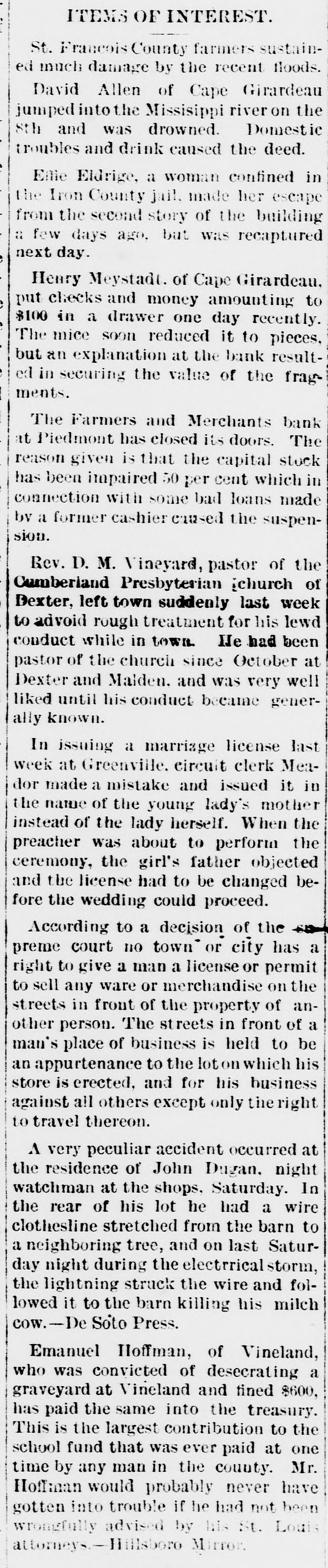 ITEMS OF INTEREST. St. Francois County farmers sustained much damage by the recent floods. David Allen of Cape Girardeau jumped into the Missisippi river on the 8th and was drowned. Domestic troubles and drink caused the deed. Ellie Eldrige, a woman confined in the Iron County jail. made her escape from the second story of the building a few days ago, but was recaptured next day. Henry Meystadt. of Cape Girardeau, put checks and money amounting to $100 in a drawer one day recently. The mice soon reduced it to pieces, but an explanation at the bank resulted in securing the value of the fragments. The Farmers and Merchants bank at Piedmont has closed its doors. The reason given is that the capital stock has been impaired 50 per cent which in connection with some bad loans made by a former cashier caused the suspension. Rev. D. M. Vineyard, pastor of the Cumberland Presbyterian ;church of Dexter, left town suddenly last week to advoid rough treatment for his lewd conduct while in town. He had been pastor of the church since October at Dexter and Maiden. and was very well liked until his conduct became generally known. In issuing a marriage license last week at Greenville. circuit clerk Meador made a mistake and issued it in the name of the young lady's mother instead of the lady herself. When the preacher was about to perform the ceremony, the girl's father objected and the license had to be changed before the wedding could proceed. According to a decision of the preme court no town or city has a right to give a man a license or permit to sell any ware or merchandise on the streets in front of the property of another person. The streets in front of a man's place of business is held to be an appurtenance to the loton which his store is erected, and for his business against all others except only the right to travel thereon. A very peculiar accident occurred at the residence of John Dugan. night watchman at the shops, Saturday. In the rear of his lot he had a wire clothesline stretched from the barn to a neighboring tree, and on last Saturday night during the electrrical storm, the lightning struck the wire and followed it to the barn killing his milch cow.-De Soto Press. Emanuel Hoffman, of Vineland, who was convicted of desecrating a graveyard at Vineland and tined $600, has paid the same into the treasury. This is the largest contribution to the school fund that was ever paid at one time by any man in the county. Mr. Hoffman would probably never have gotten into trouble if he had not been wrongfully advised by his St. Louis attorneys.-Hillsboro Mirror.