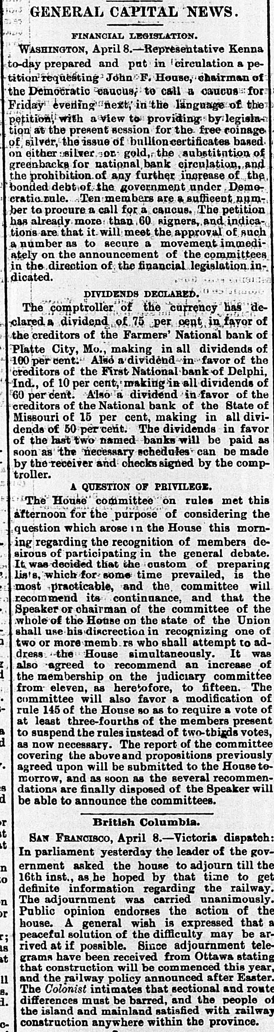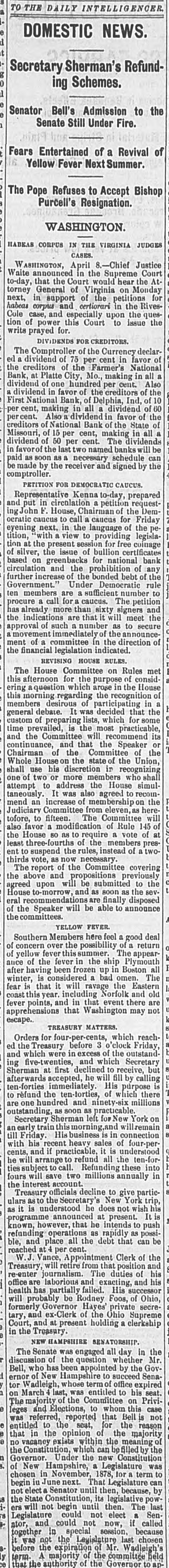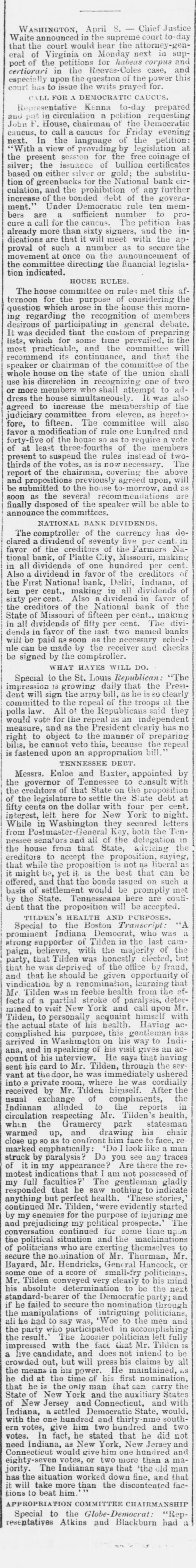 WASHINGTON, April 8. - Chief Justice Waite announced in the supreme court to day that the court would hear the attorney-general of Virginia on Monday next in support of the petitions for habeas corpus and certiorari in the Reeves-Coles case, and especially upon the question of the power this court has to issue the writs prayed for. CALL FOR A DEMOCRATIC CAUCUS. Representative Kenna to-day prepared and put in circulation a petition requesting John F. House, chairman of the Democratic caucus, to call a caucus for Friday evening next. In the language of the petition: With a view of providing by legislation at the present session for the free coinage of silver; the issuance of bullion certificates based on either silver or gold; the substitution of greenbacks for the National bank circulation, and the prohibition of any further increase of the bonded debt of the goverament. Under Democratic rule ten members are a sufficient number to procure a call for the caucus. The petition has already more than sixty signers, and the indications are that it will meet with the approval of such a number as to secure the movement at once on the announcement of the committee directing the financial legislation indicated. HOUSE RULES. The house committee on rules met this afternoon for the purpose of considering the question which arose in the house this morning regarding the recognition of members desirous of participating in general debate. It was decided that the custom of preparing lists, which for some time prevailed, is the most practicable, and the committee will recommend its continuance, and that the speaker or chairman of the committee of the whole house on the state of the union shall use his discretion in recognizing one of two or more members who shall attempt to address the house simultaneously It was also agreed to increase the membership of the judiciary committee from eleven, as heretofore, to fifteen. The committee will also favor a modification of rule one hundred and forty-five of the house SO as to require a vote of at least three-fourths of the members present to suspend the rules instead of twothirds of the votes, as is now necessary. The report of the chairman, covering the above and propositions previously agreed upon, will be submitted to the house to morrow, and as soon as the several recommendations are finally disposed of the speaker will be able to announce the committees. NATIONAL BANK DIVIDENDS. The comptroller of the currency has declared a dividend of seventy five per cent. in favor of the creditors of the Farmers National bank, of Platte City, Missouri, making in all dividends of one hundred per cent Also a dividend in favor of the creditors of the First National bank, Delhi, Indiana, of ten per cent., making in all dividends of sixty per cent. Also a dividend in favor of the creditors of the National bank of the State of Missouri of fifteen per cent., making in all dividends of fifty per cent. The dividends in favor of the last two named banks will be paid as soon AS the necessary sched ule can be made by the receiver and checks be signed by the comptroller. WHAT HAYES WILL DO. Special to the St. Louis Republican: "The impression 18 growing daily that the Prestdent will sign the army bill, as he is 80 clearly committed to the repeal of the troops at the polls law. All of the Republicans said they would vote for the repeal as an independent measure, and as the President clearly has no right to object to the manner of preparing bilis, he cannot veto this, because the repeal is fastened upon an appropriation bill. " TENNESSEE DEBT. Messrs. Enloe and Baxter, appointed by the governor of Tennessee to consult with the creditors of that State on the proposition of the legislature to settle the ate debt at fifty cents on the dollar with four per cent. interest, left here for New York to night. While in Washington they secured letters from Postmaster-General Key, both the Tennessee senators and all of the delegation in the house from that State, advising the creditors to accept the proposition, saying, that while the proposition is not as liberal as it might be, yet it 18 the best that can be offered, and that the bonds issued on such a basis of settlement would be promptly met by the State. Tennesseans here are confi dent that the proposition will be accepted. TILDEN'S HEALTH AND PURPOSES. Special to the Boston Transcript "A prominent Indiana Democrat, who was a strong supporter of Tilden in the last campaign, believes, with the majority of the party, that Tilden was honestly elected, but that he was deprived of the office by fraud, and that he should be given opportunity of vindication by a renomination, learning that Mc Tilden Was in feeble health from the effects of a partial stroke of paralysis, determined to visit New York and call upon Mr Tilden, to personally acquaint himself with the actual state of his health. Having accomplished his purpose, this gentleman has arrived in Washington on his way to Indiana, and in speaking of his visit gives an account of his interview He says that having sent his card to Mr. Tilden, through the ser vant at the door, he was immediately ushered into a private room, where he was cordially received by Mr. Tilden himself. After the usual exchange of compliments, the Indianan alluded to the reports in circulation respecting Mr. Tilden's health, when the Gramercy park statesman warmed up, and drawing his chair close up 80 as to confront him face to face, re marked emphatically 'Do look like a man struck by paralysis Do you see any traces of it in my appearance? Are there the remotest indications that I am not possessed of my full faculties? The gentleman gladly responded that he saw nothing to indicate anything but perfect health. These stories, continued Mr. Tilden, 'were evidently started by my snemies for the purpose of injuring me and prejudicing my political prospects. The conversation continued for some time up on the political situation and