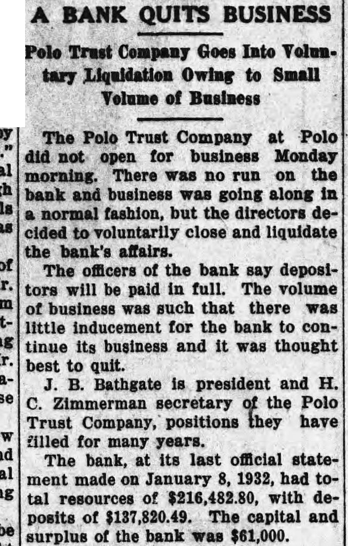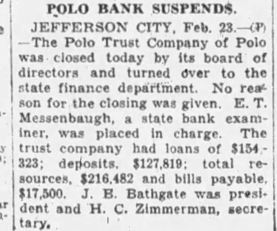 POLO BANK SUSPENDS. JEFFERSON CITY, Feb. The Polo Trust Company of Polo closed today by its board of directors turned over to the state No reat son for the closing was given. Messenbaugh, state bank examiner, placed in charge The trust company had loans of $154 323; deposits. $127,819: total resources, $216,482 and bills payable. $17,500. Bathgate president and H. C. Zimmerman, secre-