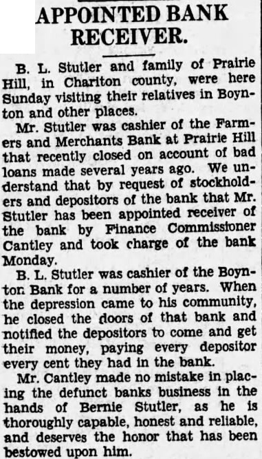 APPOINTED BANK RECEIVER. B. L. Stutler and family of Prairie Hill, in Chariton county, were here Sunday visiting their relatives in Boynton and other places. Mr. Stutler was cashier of the Farmers and Merchants Bank at Prairie Hill that recently closed on account of bad loans made several years ago. We understand that by request of stockholders and depositors of the bank that Mr. Stutler has been appointed receiver of the bank by Finance Commissioner Cantley and took charge of the bank B. L. Stutler was cashier of the Boynton Bank for a number of years. When the depression came to his community, he closed the doors of that bank and notified the depositors to come and get their money, paying every depositor every cent they had in the bank. Mr. Cantley made no mistake in placing the defunct banks business in the hands of Bernie Stutler, as he is thoroughly capable, honest and reliable, and deserves the honor that has been bestowed upon him.