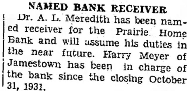 NAMED BANK RECEIVER been receiver for the Prairie Home Bank and assume his duties the near future. Harry Meyer Jamestown has been charge of the bank since the closing October