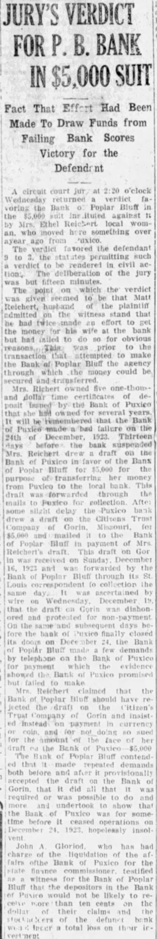 JURY'S VERDICT FOR P. B. BANK IN $5,000 Fact That Had Been Made To Draw Funds from Failing Bank Scores Victory for the Defendent circuit court o'clock returned verdict favoring the Bank Poplar Bluff in the $5,000 against by Mrs. Ethel local woman. who moved here something over ayear ago from 'uxico. The verdict favored the defendant to the permitting such verdict rendered in civil aetion, The deliberation of the jury but fifteen minutes. The point which the verdict given to that Matt was Reichert, husband the plaintiff admitted the witness stand that be had an effort to get money his wife at the bank but had failed to do so for obvious This was prior to the reasons, transaction attempted to make the Poplar Bluff the agency through which the money could be Mrs. Richert owned five and dollar time of Issued by the Bank of Puxico posit that she for rimembered that the Bank Puxice failure on the 24th of 1923. Thirteen days before the bank suspended Mrs. Reichert drew draft on the Bank of Púxico in favor the Bank of Poplar Bluff for $5,000 for the purpose transferring her money from Puxico to the local bank This draft forwarded through the mails to Fuxico collection After some silght delay Puxico draft the Citizens Company Gorin. Missouri, for and mailed the Bank of Poplar Bluff in payment of Mrs. draft draft on Gor on Sunday 1923 and forwarded by the Bank of Poplar Bluff through its St Louis collection the same day. It by on December that the draft on Corin was dishon and for non On the days fore the bank Puxico finally closed its doors on the Bank Poplar Bluff few demands by telephone on the Bank of Puxico for payment evidence showed Bank Puxico promised but failed Mrs. Reichert claimed that the Bank Poplar Bluff should have jected the draft the Titizen's Trust Company of Gorin and insist Instead payment currency coin, and for doing sued for the amount the face her draft the Bank of Puxico $5,000 The of Poplar Bluff that made repeated demands both before and provisionally accepted draft on the Bank Gorin. that did all that required or possible do and and undertook show that the Bank Puxico was for sometime before it ceased operations on December 24. 1923. hopelemsly insol vent John Gloriod. who has charge of the liquidation of the fairs ofthe Bank of Puxico for the finance commissioner testified witness for the Bank of Poplar Bluff that the depositors the Bank would not be likely to more than ten cents the their claims and of the a total loss on