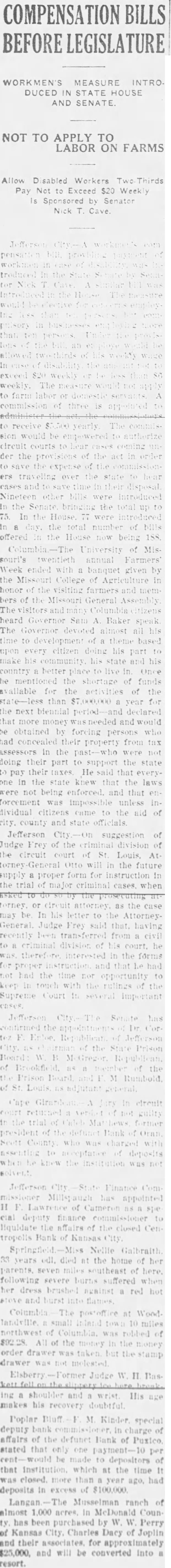 COMPENSATION WORKMEN'S MEASURE DUCED STATE HOUSE AND SENATE NOT TO APPLY TO LABOR ON FARMS Allow sabled Workers Pay Not Exceed $20 Weekly Sponsored Senator to farm commission sion circuit courts der the of Nineteen the Senute In House. day. the total number offered the House being 188 Missouri's twentieth annual Farmers ended banquet given by the Missouri College of Agriculture honor of the farmers members of Missouri General Columbia heard Governor Sam Baker The almost his time of based upon every citizen doing his part make community. his state country better live Once he mentioned the shortage of funds available for the of the than year the next biennial that more money and be obtained by foreing persons had concealed their property from tax assessors in the were not doing their part support the pay their taxes that everyone in the state knew that the laws not being enforced. and that forcement was impossible unless dividual citizens came the aid county and state officials Jefferson suggestion Judge of the of the circuit court Louis, At Otto the future supply proper form for instruction in the trial of major criminal cases when may his letter to the AttorneyGeneral. Judge Frey said that. recently transferred from criminal court. interested the forms that had had the time opportunity touch rulings the several Prison Board the circuit Bank charged appointed cial deputy finance liquidate closed tropolls Bank of Nellie Galbraith odl. died the home her parents. southeast of here. severe burns suffered her dress brushed against red hot Wood. northwest Columbia. the money the order drawer was taken but drawer Judge W. Bas. ing shoulder and His makes his recovery doubtful Poplar Kinder special deputy bank in charge affairs of defunet Bank of Puxico. stated that only one per be made to depositors of that Institution. which at the time closed. more than year ago, had deposits in excess of $100,000 Musselman ranch of almost acres. In Counhas been by Perry Kansas City, Charles Dacy of Joplin their associates, for approximately $25,000. and will be converted into resort.
