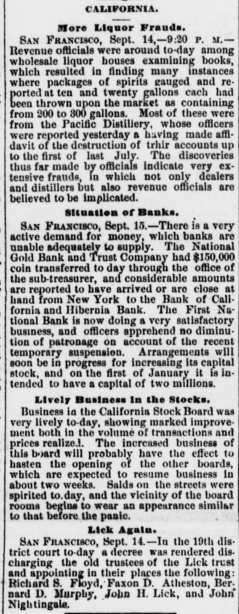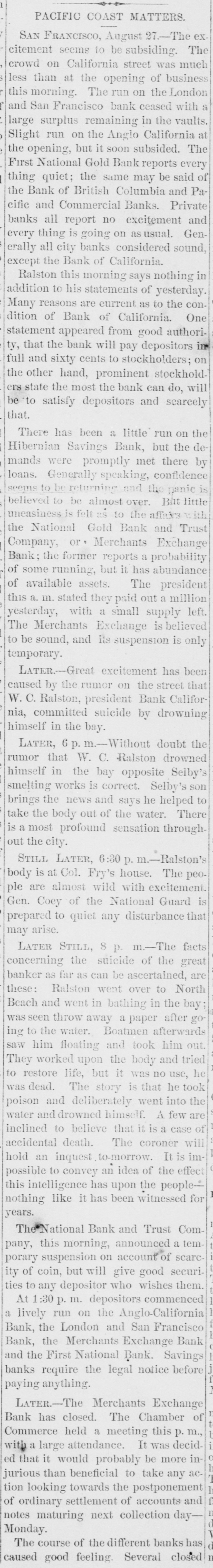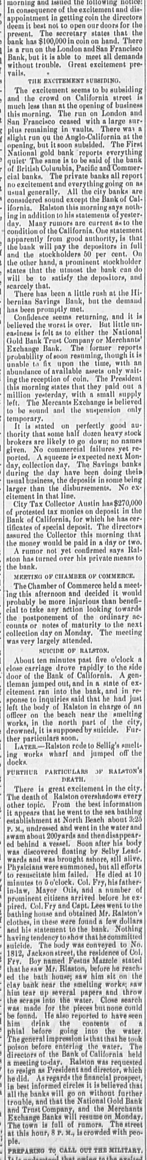 notice and dis morning consequence of the exeicement coin the directors In in getting doors for the present. appointment open our the There $100,000 and San deem it best bank has The not secretary London to in coin states on hand. Francisco that demands without is a run on the able to meet all preBank, but trouble. it is Great excitement EXCITEMENT is vails. THE seems SUBSIDING. to be subsiding street The excitement California and the than at the opening London and much less crowd The on run on of business surthis morning. ceased with a large was a San Francisco remaining in vaults. agio-California There at the First slight plus run qu the subsided. everything The gold bank to be said of the opening, National but same it soon is reports and Commer- bank quiet The Columbia, Pacific banks all report cial of British banks. The everything rivate going on are as excitement and All the city banks of Cal usual nothvester considered generally. Ralston sound except this statements morning the Bank says of ifornia. to his current as to the Many California One is day. ing in addition of the rumors are authority, statement that full apparently the depositors cent. On the condition bank stockholders will from pay good 50 per stockholder in and the hand, a prominent the bank can and do the states other that the satisfy utmost the depositors, bernian Savings met. will scarcely There be that. has to been Bank, n little but rush the at demand the it Hi is returning, has been Confidence promptly worst seems is over. the But and National little unthe as to either Merchants eariness is Company report Gold believed Bank felt Bank. Trust The resuming former or though with it an Exchange of soon the time, wait to fix assets President unable probability abundance of available upon coin. The only out the that they believed this ing morning reception states of with a small paid is supply be to sound million yesterday, Exchange only left. The Mercants and the suppension au good that some to go down; no vet temporarted thority It is are likely on half perfectly dozen failures heavy names Mon stock rebrokers No commercial expected next banks given. A squeeze The Savings their ported. collection day, have been in doing some being during business, the disbursements. larger in that Austin usual day, than the day the line. deposits has $270,000 No ex in the citement City Tax Collector tax monies on which deposit he has cer of protested of California deposit. for The directors that Bank of special this morning or two ston assured tificates the would Collector be confirmed paid in day says Ral to the bank. the A money rumor has turned not over yet his private means OF CHAMBER OF COMMERCE. held a meet MEETING Chamber of Commerce decided it would this injurious towards ing probably The afternoon be more action and lookin than ordinary benefi- nccial to take any of the to the next the postponement or notes Monday. maturity The meeting counts collection day on attended. was very largely RALSTON. HUICIDE OF five o'clock minutes past rapidly to the A gen- side carriage of state of About ten Bank drove California. ex re close door of the out, and bank, in a and in just citement tleman jumped ran inquiries into the said that in charge he had of an to Ralston smelting sponse the body of near the the city, officer works, left on in it the the is #11 beach north apposed part by suicide. of smelt FurSellig's ing drowned, ther LATER- particulars Ralston wharf soon. and rode to jumped off the FURTHUR DEATH. in the docks. work PARTICULARS OF RALATON'S city. excitement every There is great Ralston information The death o of the best bathing other topics.net he went Beach about blishment appears From North went to in the the sea disappear water 3:20 and and and thend his body P. M., about Soon after Selby Lead ed awam behind a vessel. floating ashore, by still efforts alive discovered brought bu all 10 was wards and was were summoned He died at Premincitate Physicians him failed Col. Fry number his father- of minutes to to 0 o'clock. Otis, and a before he the ex in-law, Mayor citizens and arrived Capt. Lees Mr. went Ralston's to prominent vired. Col. Fry and obtained few dollars bathing house in these were to the found bank. commi Nothing clothes, and his statement to show that conveyed he to Cola No tendency was of suicide. 1812, Jacksonstre street, Festus before Mazzcle he reach the Fty. Boy Mr. Rlaston, RAW him sit on having The named body the residence stated saw the bath the smelting and throw clay ed that he bank RAW up near house; several water. papers Close work search could was made He also content him the scraps tear into for the the reported pieces but to none have of seen water The general entering the California him phial be The found. drink before pression going the of into that water. that the equested he held took poison before of the Bank Ralston was which directors director, prospect a resign as regard the it is believe to meeting did. Asregar to-day. President circles and financial without further that Bank he in best informed will go National on Gold Merchants the bank and that the and the Monday The trouble, Trust Company will resume on The street and Exchange town is Banks full 8 P. M., of is rumors. a crowded with peoMILITARY. ple. at this ARING hour, TO CALL OUT THE tathe