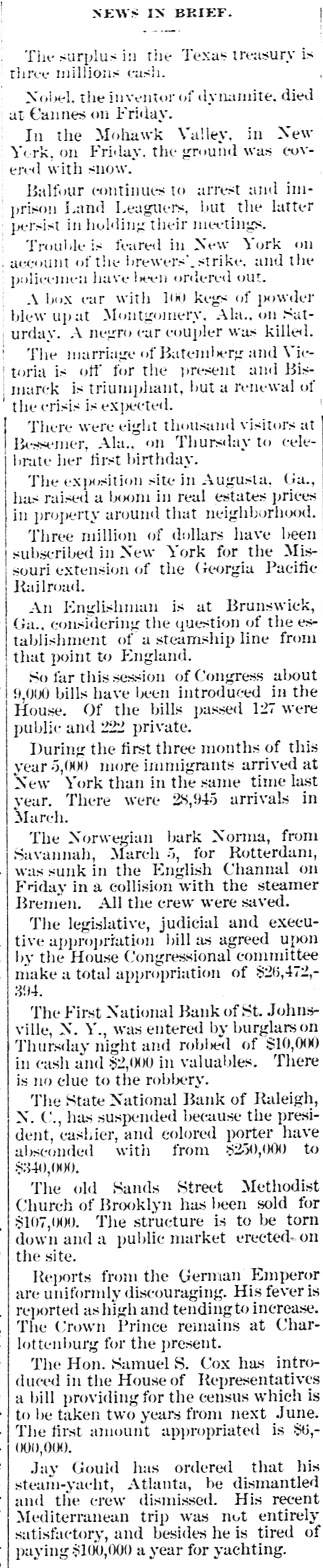 MARTINSBURG. W. VA.. SATURDAY. DECEMBER 29, 1888. 280(000),000 marks ps river steamer Joppa; M. T. Harrison Gar Va. 10. Rear Admiral Le-Roy, in New York. Lynchburg, stag, rett, of Baltimore, drowned. 12. Colorow, the Indian chief. Lord Landsdowne app Rev. Dr. Layton Coleman made Protestant Born 1823. 13. Gen. James C. Lane, in New York. Born 1823 of India Lord Stan bishopief Delaware. New York. Born 16. Mrs. Timothy Merrick (Proftssor Braislin), as 9. Operation of tracheot 16. Train robbery at Muscagee, L T. Holyoke, Mass. Born 1838. crown prince of Gert 17. Train sobbery near Junction City, M. T. 1928. Born 10. Verdict of the coron 18. Mme. Gen. Diss Debar sentenced tothe p6nBaltimore in Sun, AS THE WORLD WAGS. town, Ireland, evictie itentiary for six months. JANUARY. Lord. Dufferin resign 22. Disastrous floods in Mexico. Many hundreds of the Adams India. 4. Bark Alfred I. Show wrecked off Irish coasts drowned. lost. 18. Riots at Guyaquil, : 24. Holbrook, A. T., nearly destroyed in Boston. Born many wounded. 6. English steamer Maude foundered in Black 25. Paying Teller Pitcher, of the Union.bank of 15. The English reported sea; 12 lost. Providence, R. I., is a defaulter and fugitive. of the intion of Venezuela. 10. Thirteen killed at Haverhill bridge over the JULY. Merrimac on Boston and Maine railroad. Douglas Pyne, M. I 3. John F. Van Loan of the Second National bank in New Boggs, months imprisonmen 12. Blizzard in the northwest. Immense damage of Jersey city, defaulter in $15,000. 18. Memorial window in done; many frozen to death. 4. Mrs. James K. Polk, widow of President Polk, New M. in D., London, to John Mi 17. E. C. Walthall re-elected senator from Missisat Nashville, started the machinery of the Childs, unveiled. sippi. Cincinnati Exhibition by electricity. MAI 18. Norwegian bank Freidas sunk in collision with Wm. R. Flack lost his life trying to navigate in Fond du Lac, 1. Daniel Wilson, son-in British steamer Teronto off Ireland: 18 the whirlpool rapids, Niagara. diocese. Bord of France, convicted drowned. 9. Cal. Thos. L. Casey made chief of engineers tion with the sale-of Court Clerk Irion, of Birmingham, Ala, deof the army. in Ann Arbor, 17. Prince Oscar of Swe faulted in $20,000. 18. More than 500 killed by volcanie eruptions in ried at Bournemeuth 19. Hatfield-McCoy row. Japan. of ex-president 20. Gen. Caffarel convict 22. Fourteen burned to death at Tower, Minn. 17. Hronek, Chebouth, and Chapels, three Bo1799. Born a fine for complicity 23. Charles "Brien, cashier, and Elmer E. Morse, hemian Anarchists, arrested in Chicago, riffithsville, W. Va. scandal. Mme. Lime bookkeeper, Albany First National bank, decharged with conspiracy to burn the city. for ninety daily 21 Trial of Gen. Boulan faulted in $200,000. AUGUST. cided against him. 24. Colliery explosion at Wellington, B. C.; 25 % Blinky Morgan hanged in Columbus, O. 1821. Born 26. M. Wilson won his or killed. Twenty-one lives lost in a fire on the Bowery, Born Minn. tion with the French Paul, 25. United States Senator Wilson, of Iowa, reNew York SO. M. Tirard, premier of elected. 4. Terrible tornado in Cuba. Heavy loss of life. AP ishop of Toronto 25, 26. Great storm on the Atlantic coast. 9. Yellow fever well under way at Jacksonville, 2. German frontier poli 27. Deficit of $350,000 alleged in the accounts of Fla. in New and refused admittan Morgan, the late government of Manitoba. 10. Ten persons burned to death at Chattanooga, of any persons.not pr FEBRUARY. Tenn. New French cabinet 1. Twenty-two drowned in wreck of the British Hugh M. Brooks, alias Maxwell, hanged at St. Floquet, prime minis publisher of The bark Absacom near mouth of the Columbia Louis. 1807. of foreign affairs; E river. 14. Woman suffrage declared unconstitutional in war. of Born Paris. in 5. White Cap outbreak in Indiana. Wyoming. 8. Riots is Ireland at K 7. Failure of the Metropolitan National bank, 16. Collision of steamers Geyser and Thingvalla. in Jamaica Clark, rea, at meeting of the Cincinnati, President Means, Cashier Harper More than lost. proclaimed. and others arested. 21. Bill Miles, anti-Bald Knobber, shoots and kills Mass. 9. Goa. Boulanger elec Aged 8. Murder of Amos J. Snell, Chicago. (Tascott Capt. N. Kinney, Bald Knobber chief, at deputies the dep case). Ozark, Mo. declined to.serve. ag-Harman, under Henry Reece, cashier Continental hotel PhilaSevere storms on the gulf and Atlantic coasts. 1838. 10. Malietoa, king of St delphia, defaulter in $60,000. 22. Gigantic opium smuggling scheme unearthed. Sheridan Gen of Cameroons, Africa, b 11. James Albert won six-day go-as-you-please Frank Gardner and other guilty parties after15. Boulanger elected to walking match in New York, breaking world's ward convicted and imprisoned. from the department wburyport, Mass record. Thirty-four lives lost in steamer collision in San 10. Insurrection in Roum 17. Two American ships ordered to Tangiers, Francisco bay. troops and villages bi Germany King Morrocco, to settle row between the sultan 23. Fourteen killed by boiler explosion at Neemah, Boulanger took his se and the United States consul Neb. deputies. of York, England. 19. Tornado at Mt. Vernon, Ills.; 21 killed. 26. Quarantine ordered against Jacksonville, Fla. 20. Many strikes reported 21. Twenty-five killed by explosion of boiler of Robert Garrett reported demented. in chess Demonstration by 1, steamer in the United States of Colombia. player, 81. Charles H. Litchman resigns general secreagainst Boulanger. 22. Mackay and Flood quarrel over losses in wheat taryship of the Knights of Labor. jured. Peacedale, R. L and dissolve partnership. SEPTEMBER. 80. Much comment in E 2. Battle between outlaws and vigilantes near 27. Forty lost by explosion of a ferryboat at ValIsland. Born the pope's decree a Palladora, No Man's Land. Seventeen outlejo, Cal paign. laws killed. MARCH. MA in San Francisco. 3. Sarah Althea Hill jailed for three days for 1. International railway connecting Mexican Cen8. Will