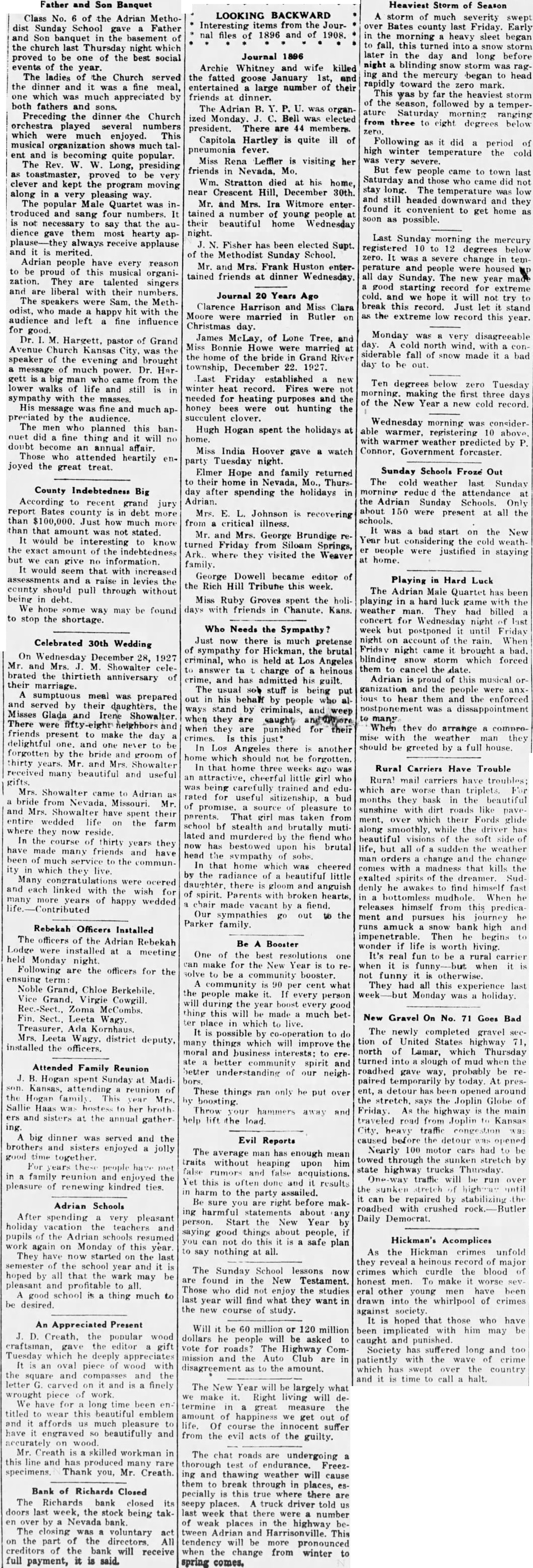 Father and Son Banquet Class No. of the Adrian Methodist Sunday School gave Father and Son banquet in the basement of the church last Thursday night which proved to be one of the best social events the year. The ladies of the Church served the dinner and it was fine meal, one which was much appreciated by both fathers and sons. Preceding the dinner the Church orchestra played several numbers which were much enjoyed. This musical organization shows much talent and becoming quite popular. The Rev. W. W. Long, presiding toastmaster, proved to be very clever and kept the program moving along in very pleasing way. The popular Male Quartet was introduced and sang four numbers. It not necessary to say that the audience gave them most hearty apalways receive applause and is merited. Adrian people have every reason to be proud of this musical organization. They are talented singers and are liberal with their numbers. The speakers were Sam. the Methodist, who made happy hit with the audience and left fine influence for good. Dr. Hargett, pastor of Grand Avenue Church Kansas City, was the speaker of the evening and brought message of much power. Dr. Hargett big man came from the lower walks of life and still is in sympathy with the masses. His message was fine and much appreciated by the audience. The men who planned this banouet did fine thing and will doubt become an annual affair. Those who attended heartily joyed the great treat. County Indebtedness Big According to recent grand jury report Bates county in debt more than $100,000. Just how much more than that amount was not stated. would be interesting to know the exact amount of the indebtedness but give no information. would seem that with increased assessments and raise in levies the county should pull through without being debt. We hope some way may be found to stop the shortage. Celebrated 30th Wedding On Wednesday December 28, 1927 Mr. and Mrs. Showalter celebrated the thirtieth anniversary of their marriage. sumptuous meal was prepared and served by their daughters. the Glada and Irene Showalter. There were fifty-eight and friends present to make the day delightful one. and one to forgotten by the bride and groom of thirty years. Mr. and Mrs. Showalter received many beautiful and useful gifts. Mrs. Showalter came to Adrian bride from Nevada, Missouri. Mr. and Mrs. Showalter have spent their entire wedded life the farm where they now reside. In the course of thirty years they have made many friends and have been of much to the community in which they live. Many were ocered and each linked with the wish for many more years of happy wedded Rebekah Officers Installed The officers of the Adrian Rebekah Lodge were installed at meeting held Monday night. Following are the officers for the ensuing Noble Grand, Chloe Berkebile. Vice Grand. Virgie Cowgill. Rec.-Sect., Zoma Fin. Sect., Leeta Wagy. Treasurer. Ada Kornhaus. Mrs. Leeta Wagy. district deputy, installed the officers. Attended Family Reunion J. Hogan spent Sunday at MadiKansas, attending reunion of the Hogan family This Mrs. Sallie Haas hostess to her broth. and sisters at the annual gathering. big dinner was served and the brothers sisters enjoyed jolly good time together. For people have met family reunion enjoyed the pleasure of renewing kindred ties. Adrian Schools After spending very pleasant holiday vacation the teachers pupils of the Adrian schools resumed work again on Monday of this year They have now started on the last semester the school year and it hoped by all that the wark may be pleasant and profitable all. good school is thing much to desired. An Appreciated Present D. Creath, the popular wood craftsman, the editor gift Tuesday which he deeply appreciates oval piece wood with the square and compasses and the letter carved and is finely wrought piece work. We have for long time been titled to wear this beautiful emblem and affords us much pleasure have engraved beautifully and accurately on wood. Mr. Creath skilled workman in this and produced rare many specimens. Thank you, Mr. Creath. Bank of Richards Closed The Richards bank closed its doors last week, the stock being takby Nevada bank. The closing voluntary on the part the directors All creditors the bank will receive full payment, it is said. LOOKING BACKWARD Interesting items from the Journal files 1896 and of 1908. Journal 1896 Archie Whitney and wife killed the fatted goose January 1st, and entertained large number of their friends at dinner. The Adrian B. was organized Monday. Bell was elected president. There are 44 members. Capitola Hartley is quite ill of fever. Miss Rena Leffler is visiting her friends in Nevada, Mo. Wm. Stratton died at his home, near Crescent Hill, December 30th. Mr. and Mrs. Ira Witmore entertained number of young people at their beautiful home Wednesday night. Fisher has been elected Supt. of the Methodist Sunday School. Mr. and Mrs. Frank Huston entertained friends at dinner Wednesday. Heaviest Storm of Season A storm of much severity swept over Bates county last Friday. Early in the morning heavy sleet began to fall, this turned into storm later the day and long before night blinding storm was raging and the mercury began to head rapidly the zero mark. This was by far the heaviest storm of the season, followed by temperature Saturday morning ranging from three to eight degrees below Following as did period of high winter temperature the cold very severe. But people came to town last Saturday and those who came did not stay long. The temperature was low and still headed downward and they found it convenient to get home soon as possible. Last Sunday morning the mercury registered 10 12 degrees below zero. It was severe change in temperature and people were housed all day Sunday. The new year good starting record for extreme Journal 20 Years Ago cold. and we hope it will not try Clarence Harrison and Miss Clara break this record. Just let stand Moore were married in Butler on as the extrem