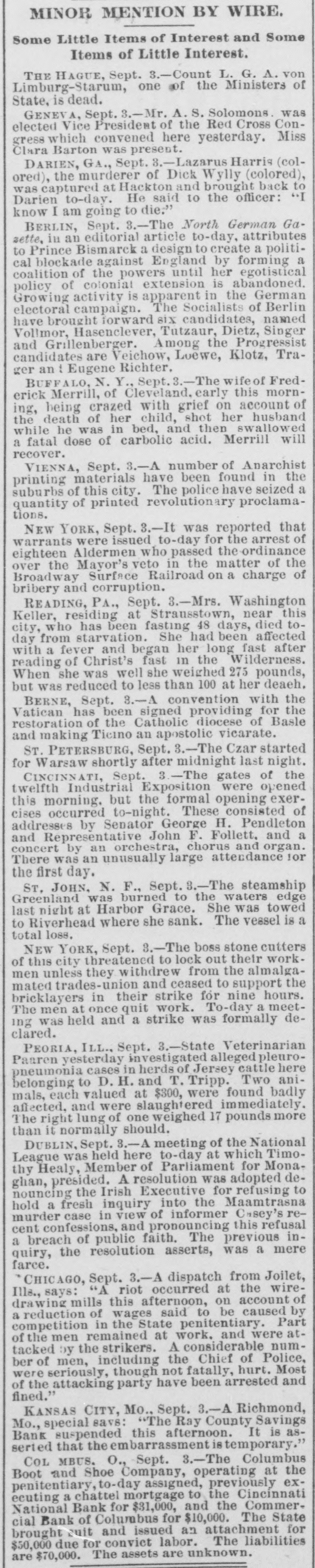 MINOR MENTION BY WIRE. Some Little Items of Interest and Some Items of Little Interest. THE HAGUE, Sept. 3.-Count L. G. A. von Limburg-Starum, one of the Ministers of State, is dead. GENEVA, Sept. 3.-Mr. A. S. Solomons was elected Vice President of the Red Cross Congress which convened here yesterday. Miss Clara Barton was present. DARIEN, GA., Sept. 3.-Lazarus Harris (colored), the murderer of Dick Wylly (colored), was captured at Hackton and brought back to Darien to-day. He said to the officer: "I know I am going to die." BERLIN, Sept. 3.-The North German Gazette, in an editorial article to-day, attributes to Prince Bismarck a design to create a political blockade against England by forming a coalition of the powers until her egotistical policy of colonial extension is abandoned. Growing activity is apparent in the German electoral campaign. The Socialists of Berlin have brought forward six candidates, named Vollmor, Hasenclever, Tutzaur, Dietz, Singer and Grillenberger. Among the Progressist candidates are Veichow, Loewe, Klotz, Trager an : Eugene Richter. BUFFALO, N. Y., Sept. 3.-The wifeof Frederick Merrill, of Cleveland, early this morning, being crazed with grief on account of the death of her child, shot her husband while he was in bed, and then swallowed a fatal dose of carbolic acid. Merrill will recover. VIENNA, Sept. 3.-A number of Anarchist printing materials have been found in the suburbs of this city. The police have seized a quantity of printed revolutionary proclamations. NEW YORK, Sept. 3.-It was reported that warrants were issued to-day for the arrest of eighteen Aldermen who passed the ordinance over the Mayor's veto in the matter of the Broadway Surface Railroad on a charge of bribery and corruption. READING, PA., Sept. 3.-Mrs. Washington Keller, residing at Strausstown, near this city, who has been fasting 48 days, died today from starvation. She had been affected with a fever and began her long fast after reading of Christ's fast in the Wilderness. When she was well she weighed 275 pounds, but was reduced to less than 100 at her deach. BERNE, Sept. 3.-A convention with the Vatican has been signed providing for the restoration of the Catholic diocese of Basle and making Ticino an apostolic vicarate. ST. PETERSBURG, Sept. 3.-The Czar started for Warsaw shortly after midnight last night. CINCINNATI, Sept. 3.-The gates of the twelfth Industrial Exposition were opened this morning, but the formal opening exercises occurred to-night. These consisted of addresses by Senator George H. Pendleton and Representative John F. Follett. and a concert by an orchestra, chorus and organ. There was an unusually large attendance for the first day. ST. JOHN, N. F., Sept. 3.-The steamship Greenland was burned to the waters edge last night at Harbor Grace. She was towed to Riverhead where she sank. The vessel is a total loss. NEW YORK, Sept. 3.-The boss stone cutters of this city threatened to lock out their workmen unless they withdrew from the almalgamated trades-union and ceased to support the bricklayers in their strike for nine hours. The men at once quit work. To-day a meeting was held and a strike was formally declared. PEORIA, ILL., Sept. 3.-State Veterinarian Paaren yesterday investigated alleged pleuropneumonia cases in herds of Jersey cattle here belonging to D. H. and T. Tripp. Two animals, each valued at $300, were found badly affected, and were slaughtered immediately. The right lung of one weighed 17 pounds more than it normally should. DUBLIN, Sept. 3.-A meeting of the National League was held here to-day at which Timothy Healy, Member of Parliament for Monaghan, presided. A resolution was adopted denouncing the Irish Executive for refusing to hold a fresh inquiry into the Maamtrasna murder case in view of informer Casey's recent confessions, and pronouncing this refusal a breach of public faith. The previous inquiry, the resolution asserts, was a mere farce. "CHICAGO, Sept. 3.-A dispatch from Joilet, Ills., says: "A riot occurred at the wiredrawing mills this afternoon, on account of a reduction of wages said to be caused by competition in the State penitentiary. Part of the men remained at work. and were attacked by the strikers. A considerable number of men, including the Chief of Police, were seriously, though not fatally, hurt. Most of the attacking party have been arrested and fined." KANSAS CITY, Mo., Sept. 3.-A Richmond, Mo., special savs: "The Ray County Savings Bank suspended this afternoon. It is asserted that the embarrassment istemporary.' COL MBUS. O., Sept. 3.-The Columbus Boot and Shoe Company, operating at the penitentiary, to-day assigned, previously executing a chattel mortgage to the Cincinnati National Bank for $31,000, and the Commercial Bank of Columbus for $10,000. The State brought cuit and issued an attachment for $50,000 due for convict labor. The liabilities are $70 000 The assets are unknown.