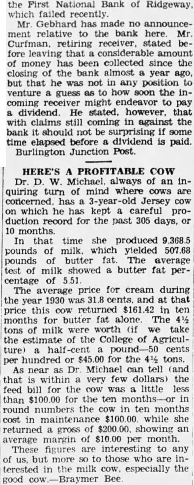the First National Bank of Ridgeway, which failed recently. Mr Gebhard has made no announcement relative to the bank here. Mr. Curfman, retiring receiver, stated before leaving that considerable amount of money has been collected since the closing of the bank almost a year ago, but that he was not in any position to venture a guess as to how soon the incoming receiver might endeavor to pay dividend. He stated. however, that with claims still coming in against the bank it should not be surprising if some time elapsed before dividend is paid. Burlington Junction Post. HERE'S A PROFITABLE COW Dr. D. W. Michael always of an inquiring turn of mind where cows are concerned has 3-year-old Jersey cow on which he has kept careful production record for the past 305 days, or 10 months. In that time she produced 9,368.5 pounds of milk. which yielded 507.68 pounds of butter fat. The average test of milk showed a butter fat percentage of 5.51 The average price for cream during the year 1930 was 31.8 cents. and at that price this cow returned $161.42 in ten months for butter fat alone. The 4½ tons of milk were worth (if we take the estimate of the College of Agriculture) half-cent pound-50 cents per hundred or for the 4½ tons. As near Dr. Michael can tell (and that is within very few dollars) the feed bill for the cow was little less than $100.00 for the ten months-or in round numbers the cow in ten months cost in maintenance $100.00 while she returned a gross of $200.00 showing an average margin of per month. These figures are interesting to any of us, but more SO to those who are interested in the milk cow. especially the good Bee