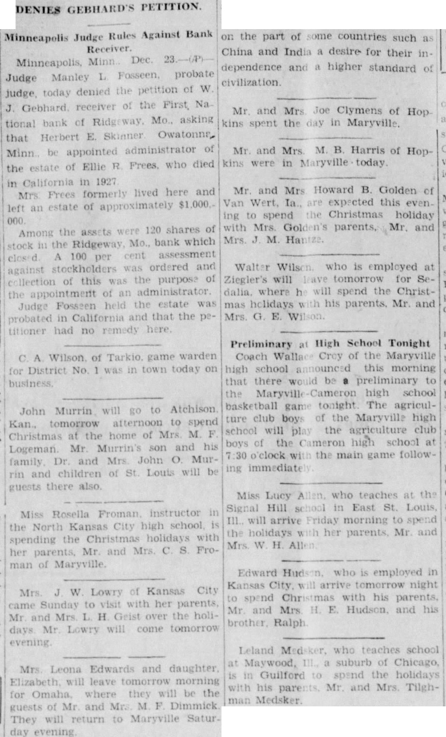 DENIES GEBHARD'S PETITION. Minneapolis Judge Rules Against Bank Minneapolis, Minn Dec. Judge Manley L Fosseen, probate judge today denied the petition of W. J. Gebhard. receiver of the First Na. tional bank of Ridgsway, Mo., asking that Herbert E. Skinner Owatonns, Minn. be appointed administrator of the estate of Ellie R Frees. who died in California in 1927 Mrs. Frees formerly lived here and left an estate of approximately $1,000.000 Among the assets were 120 shares of stock in the Ridgeway Mo., bank which closed A 100 per cent assessment against stockholders was ordered and Ellection of this was the purpose of the appointment of an administrator Judge Fosseen held the estate was probated in California and that the petitioner had no remedy here. C. A Wilson of Tarkio. game warden for District No was in town today on John Murrin will go to Atchison Kan., tomorrow afternoon to spend Christmas at the home of Mrs M. F Logeman. Mr. Murrin's son and his family Dr. and Mrs. John O. Murrin and children of St Louis will be guests there also. Miss Rosella Froman instructor in the North Kansas City high school is spending the Christmas holidays with her parents, Mr and Mrs. C. S. Froman of Maryville Mrs. J W Lowry of Kansas City came Sunday to visit with her parents, Mr and Mrs L. H. Geist over the holidays Mr. Lowry will come tomorrow Preliminary at High School Tonight Coach Wallace Croy of the Maryville high school announced this morning that there would be a preliminary to the Maryville Cameron high school basketball game tonight The agriculture club boys of the Maryville high school will play the agriculture club boys of the Cameron high school at 30 o'clock with the main game following immediate Miss Lucy Allen, who teaches at the Signal Hill school in East St. Louis. Ill. will arrive Friday morning to spend the holidays with her parents, Mr. and Mrs. W H Allen Mrs Leona Edwards and daughter Elizabeth, will leave tomorrow morning for Omaha where they will be the guests of Mr. and Mrs M F Dimmick They will return to Maryville Satur. day evening. Edward Hudson. who is employed in Kansas City. will arrive tomorrow night to spend Christmas with his parents, Mr and Mrs H. E. Hudson. and his brother. Ralph Leland Medsker, who teaches school at Maywood, III., a suburb of Chicago, is in Guilford to spend the holidays with his parents. Mr. and Mrs. Tilghman Medsker.