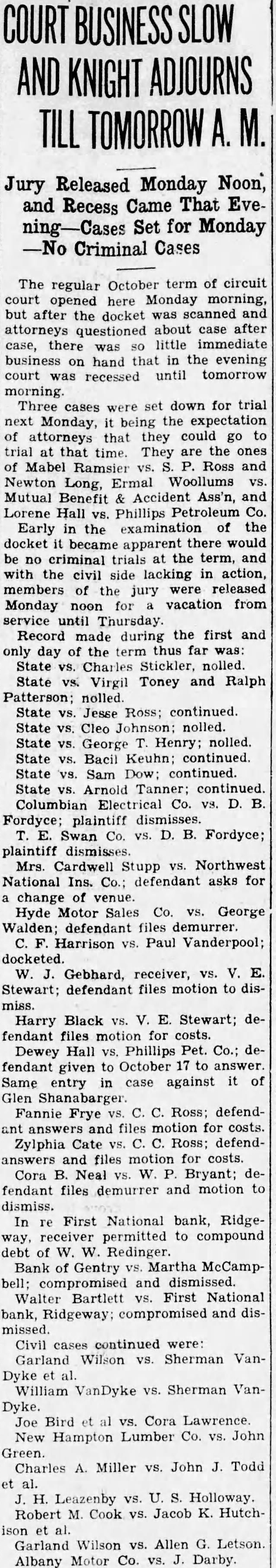 Jury Released Monday Noon, and Recess Came That EveSet for Monday Criminal Cases The regular October term of circuit court opened here Monday morning, but after docket scanned and attorneys questioned about case after case, there little immediate business hand that evening court recessed until tomorrow morning. Three set down for trial Monday, being the expectation of attorneys that they could go at that time. They the ones of Mabel Ramsier Ross and Newton Long, Ermal Mutual Benefit Ass'n, Lorene Phillips Early the examination of docket apparent would no criminal term, and with civil side lacking in action, members of the jury Monday for vacation from until Record during the first and day State Charles nolled. State Virgil Toney and Ralph State Jesse Ross; continued. State Cleo State George Henry; nolled. State Bacil Keuhn: continued. State Sam State Arnold Columbian plaintiff Swan plaintiff dismisses. Mrs. Stupp vs. Northwest National Ins. defendant asks for change Hyde Motor Sales Co. George Walden; defendant demurrer. Harrison Paul docketed. receiver, vs. Stewart: defendant motion to disHarry Black E. Stewart; defendant motion for costs. Dewey Hall Phillips Pet. Co.: defendant given to October answer Same entry case against of Glen Shanabarger Fannie Frye defendanswers and files motion costs. Zylphia Cate defendanswers files motion for costs. Cora Neal Bryant; defendant files demurrer and motion dismiss. In First National bank, Ridgereceiver permitted to compound debt of Redinger. Bank of Gentry Martha McCampcompromised and dismissed. Walter Bartlett First National bank, Ridgeway: compromised and disCivil cases continued were: Garland Wilson Sherman VanDyke William VanDyke vs. Sherman VanDyke. Joe Bird Cora Lawrence. New Hampton Lumber John Green. Charles Miller vs. John J. Todd Leazenby Holloway. Robert M. Cook Jacob K. HutchGarland Wilson vs. Allen Letson Albany Motor Co. Darby.