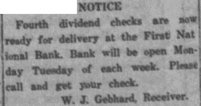 NOTICE Fourth dividend checks are now ready for delivery at the First Nat ional Bank. Bank will be open Monday Tuesday of each week. Please call and get your check. W. J. Gebhard, Receiver.