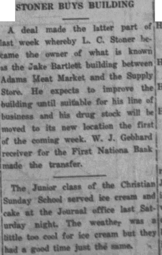 STONER BUYS BUILDING A deal made the latter part of last week whereby L. C. Stoner hecame the owner of what is known as the Jake Bartlett building between Adams Meat Market and the Supply Store. He expects to improve the building until suitable for his line of business and his drug stock will be moved to its new location the first of the coming week. W. J. Gebhard receiver for the First Nationa Bank made the transfer. The Junior class of the Christian Sunday School served ice cream and cake at the Journal office last Saturday night. The weather was tittle too cool for ice cream but they had a good time just the same.
