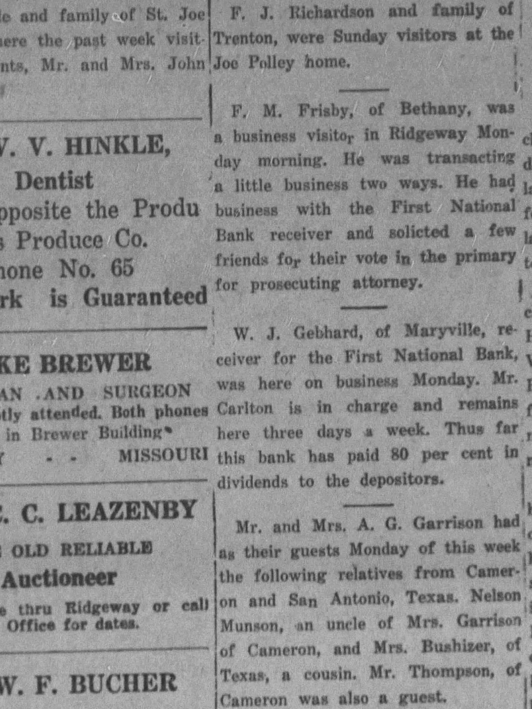 F. J. Richardson and family of Trenton, were Sunday visitors at the Joe Polley home. F. M. Frisby, of Bethany, was in Ridgeway Mona business visitor Dentist Bank receiver and cers Produce Co. Phone No. 65 for prosecuting attorney. Gebhard, of Maryville, reW. J. First National Bank, ceiver for the LAKE BREWER Mr. here on business Monday. was Office in Brewer Building* MISSOURI this bank has paid 80 per cent in dividends to the depositors. Mr. and Mrs. A. G. Garrison had THE OLD RELIABLE as their guests Monday of this week the following relatives from CamerAuctioneer on and San Antonio, Texas. Nelson Munson, an uncle of Mrs. Garrison of Cameron, and Mrs. Bushizer, of Texas, a cousin. Mr. Thompson, of DR. W. F. BUCHER Cameron was also a guest.