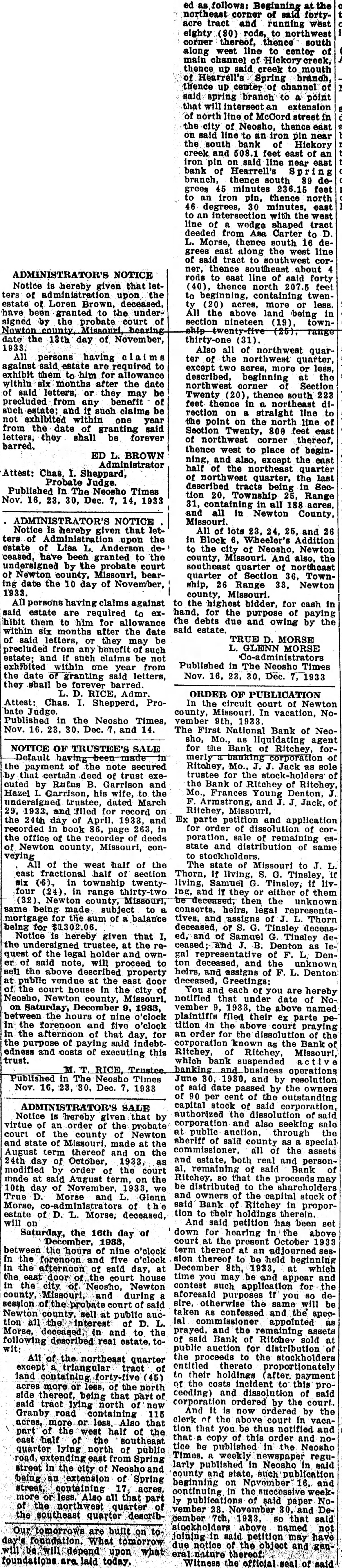 NOTICE Notice hereby given that letof upon the estate of Loren Brown, deceased, have been granted the undersigned by probate court of date the 13th day of November, 1933. All persons having against said required exhibit them for six after the date said letters, or they may be precluded from any benefit estate; and such claims be exhibited within one year from the date of granting said letters, they shall be forever barred. ED BROWN Chas, Sheppard, Probate Judge. Published The Neosho Times Nov. 30, Dec. NOTICE Notice hereby that of upon the estate Lisa Anderson ceased, have been granted to by the probate court Newton county, Missouri, beardate the 10 day of November, 1933. against estate are required to exthem to him for allowance within six months after the date said letters, or they may precluded from benefit estate: and such claims be not exhibited within one from year the date granting said letters, they shall be forever RICE. Admr. Attest: Chas. Shepperd, Probate Judge. Published the Neosho Times, Nov. and 14. NOTICE OF the payment the note secured by that certain deed of trust executed Rufus Garrison and Hazel Garrison, his wife, the undersigned trustee, dated March 1933, and filed record on day of April, 1933, recorded book 86, page 263, in the office of the of deeds Newton county, Missouri, conveying of the west half of the east fractional half of section six in township twentyfour (24), in range Newton county, being made subject the sum of balance being Notice hereby given that at the quest of legal and said note, proceed to above property at the east door the court house in the city of Neosho, county, December of nine the forenoon and five o'clock the afternoon of that day, for purpose of paying said indebtand costs of executing this trust. Published The Neosho Times Nov. Dec. 1933 SALE Notice hereby that virtue an order the the county of state of Missouri, made the August term thereof the October, 1933, as modified by order of the court made August term, the 10th day 1933, Morse Glenn Morse, of estate of Morse, deceased, will Saturday, the 16th day of December, hours of nine o'clock the forenoon and five the afternoon day, of east house city Neosho, Newton and during session the said Newton county, sell at public tion all interest of Morse, deceased, and the to described real estate, All of the northeast quarter except triangular land more or of the side that being tract lying north Granby road containing 115 acres, more that part west half of the east half the southeast quarter lying north of public road, from street the city of being extension of Spring street, acres, Also all that part the southeast quarter are built foundation. What tomorrow depend upon what follows: Beginning northeast corner of said acre tract and running west eighty rods, to northwest corner thereof, thence south along west line center of main channel of thence up creek to mouth Hearrell's Spring branch, up center of channel said spring branch point that intersect extension of north line street the city of Neosho, thence said line to an iron near south bank Hickory creek and feet east of iron said line east bank of Hearrell's branch, thence south 89 grees feet iron pin, thence north degrees, 30 east with the line of wedge shaped tract deeded from Asa Carter Morse, thence south 16 grees east along the west line said tract to southwest thence southeast about rods east line of said forty thence north feet beginning, containing twenacres, more less. above land being in section nineteen (19), town(31). Also all of northwest quarter the northwest quarter, except acres, more less, described, beginning the northwest corner Section Twenty thence south 223 feet thence northeast rection on straight line point on the north line 800 feet northwest corner thereof, thence west to place of beginning, and also, except the east half the northeast quarter northwest quarter, the last described tracts being in Section 20, Township Range containing in all 188 acres, in Newton County, Missouri. All of lots and 26 Block Wheeler's Addition the of Neosho, Newton county, Missouri. And also, the southeast quarter of northeast quarter of Section Township, 26 Range 33, Newton county, Missouri. the bidder, for cash in hand, for the purpose of paying the debts due and owing the said estate. TRUE MORSE GLENN MORSE Published in The Neosho Times Nov. 30, Dec. ORDER OF In the circuit court of county, Missouri. vacation, November 9th, 1933. The First National Bank of Neosho, as liquidating agent the Bank of Ritchey, forof Mo., Jack sole trustee for the the Bank of Ritchey Ritchey, Frances Young Denton, Armstrong, and Jack, Ritchey, Missouri, Ex parte petition and application order of of poration, of state and of same The state of to Thorn, living, Tinsley, living, Samuel Tinsley, and they either of them then unknown consorts, heirs, legal tives, and Thorn deceased, of Tinsley deceased, and of Samuel Tinsley ceased; and Denton as gal of Denand the heirs, and assigns of Denton Greetings: You and each you are hereby that under date vember the above named plaintiffs filed their ex parte tition in the above court an order the dissolution the corporation known as the Bank Ritchey, Ritchey, Missouri, which bank suspended business operations June 1930, and by said date passed by the 90 per cent of outstanding capital stock said authorized the of corporation and also seeking public auction, through the sheriff of said county special all of the and both real and personBank 80 that the proceeds may be distributed the owners the capital stock said Bank of Ritchey proportion their holdings therein. And said petition has been set down for hearing the above court the October 1933 thereof an be held beginning December 8th, 1933, time you may be and appear and contest such same as confessed and the specappointed prayed. and the remaining Bank Ritchev sold public auction for distribution the proceeds the entitled thereto their holdings (after payment the cos
