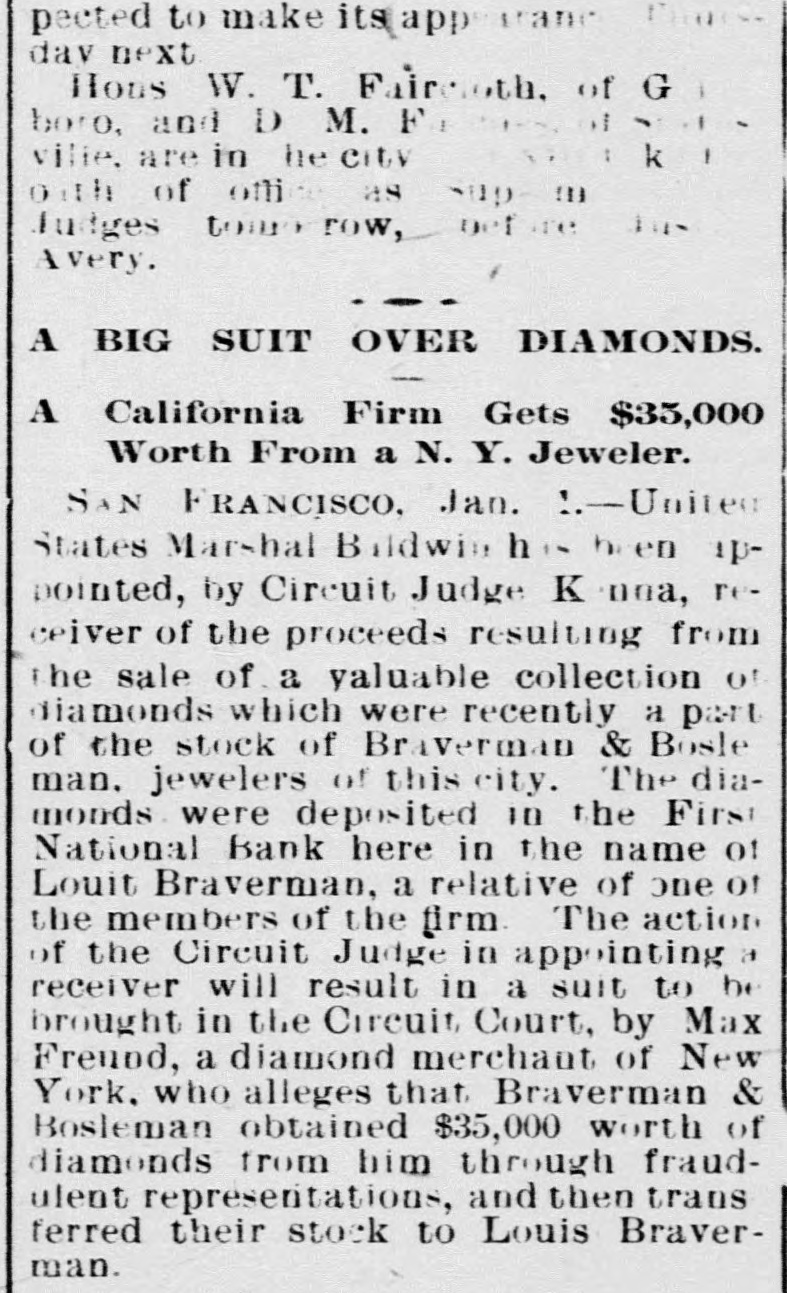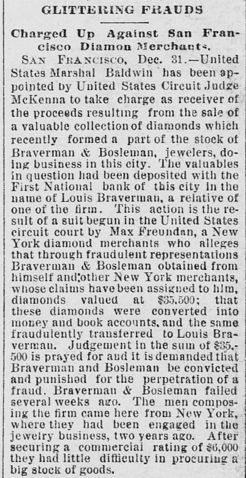 GLITTERING FRAUDS Charged Up Against San Francisco Diamon Merchants, SAN FRANCISCO, Dec. 31.-United States Marshal Baldwin has been appointed by United States Circuit Judge McKenna to take charge as receiver of the proceeds resulting from the sale of a valuable collection of diamonds which recently formed a part of the stock of Braverman & Bosleman, jewelers, doing business in this city. The valuables in question had been deposited with the First National bank of this city in the name of Louis Braverman, a relative of one of the firm. This action is the result of a suit begun in the United States circuit court by Max Freundan, a New York diamond merchants who alleges that through fraudulent representations Braverman & Bosleman obtained from himself and'other New York merchants, whose claims have been assigned to him, diamonds valued at $35.500; that these diamonds were converted into money and book accounts, and the same fraudulently transferred to Louis Bra= verman. Judgement in the sun of $35,500 is prayed for and it is demanded that Braverman and Bosleman be convicted and punished for the perpetration of a fraud. Braverman & Bosleman failed several weeks ago. The men composing the firm came here from New York, where they had been engaged in the jewelry business, two years ago. After securing a commercial rating of $6,000 they had little difficulty in procuring a big stock of goods.