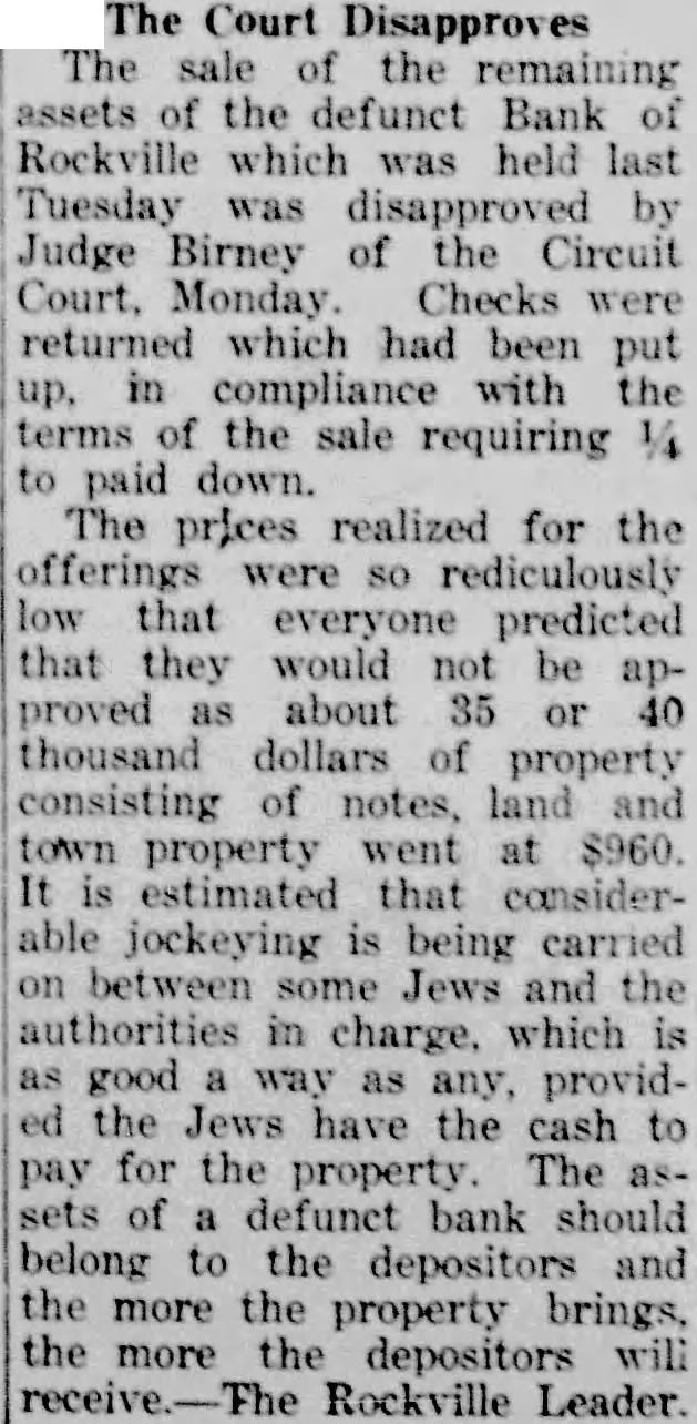 The Court Disapproves The sale of the remaining assets of the defunct Bank of Rockville which was held last Tuesday was disapproved by Judge Birney of the Circuit Monday. Checks were returned which had been put up, in compliance with the terms of the sale requiring 1/4 to paid down. The prices realized for the offerings were rediculously low that everyone predicted that they would not be approved as about 35 or 40 thousand dollars of property consisting of notes, land and town property went at $960. It is estimated that considerable jockeying is being carried on between some Jews and the authorities in charge, which is as good a way as any, provided the Jews have the cash to pay for the The asproperty. sets of a defunct bank should belong to the depositors and the more the brings, property the more the depositors will Rockville Leader.