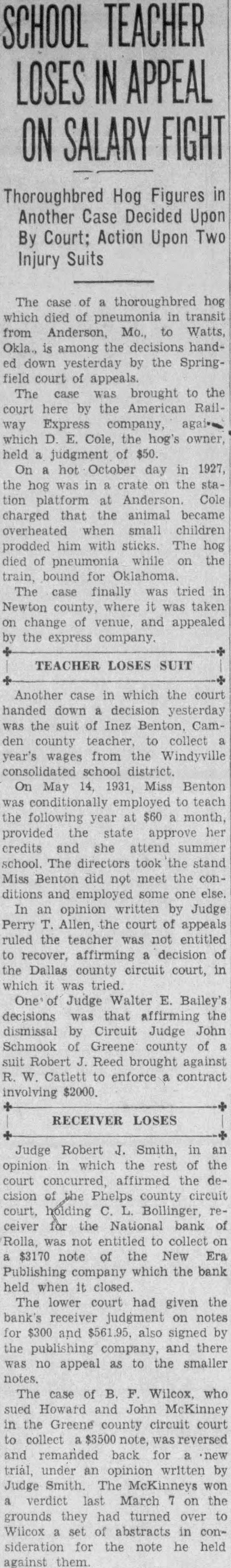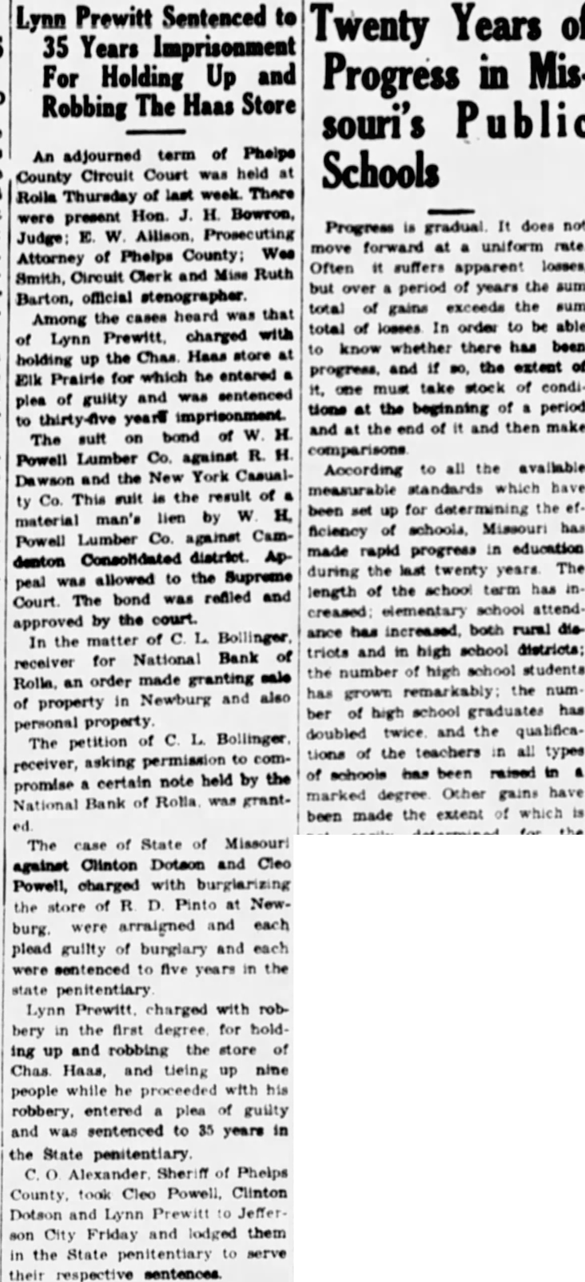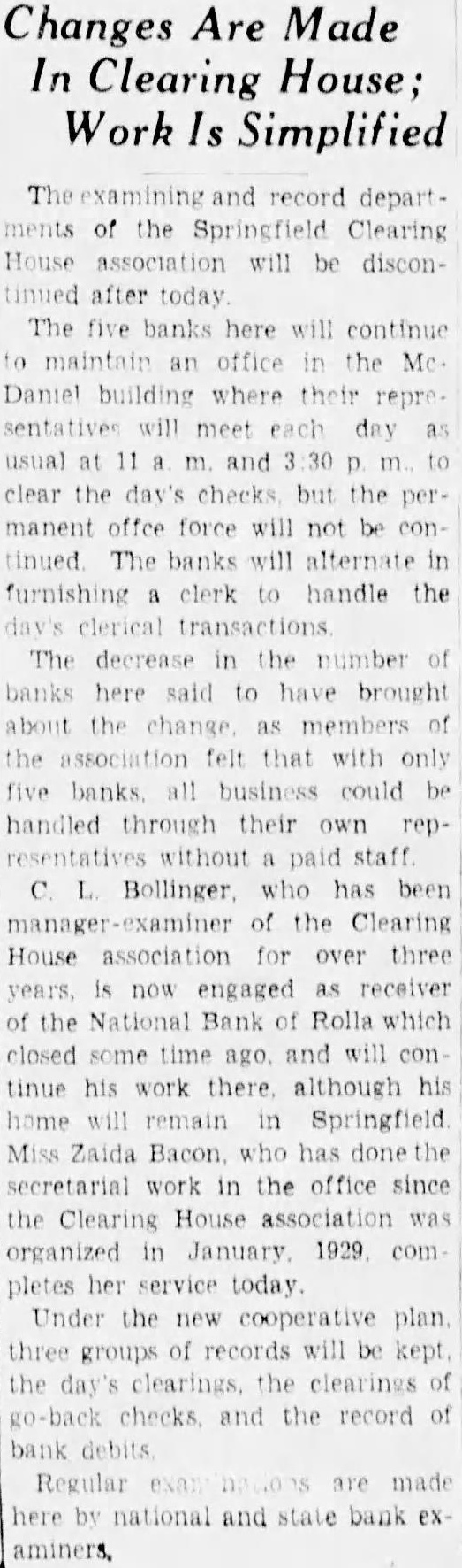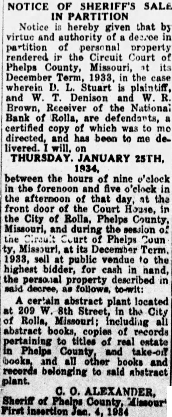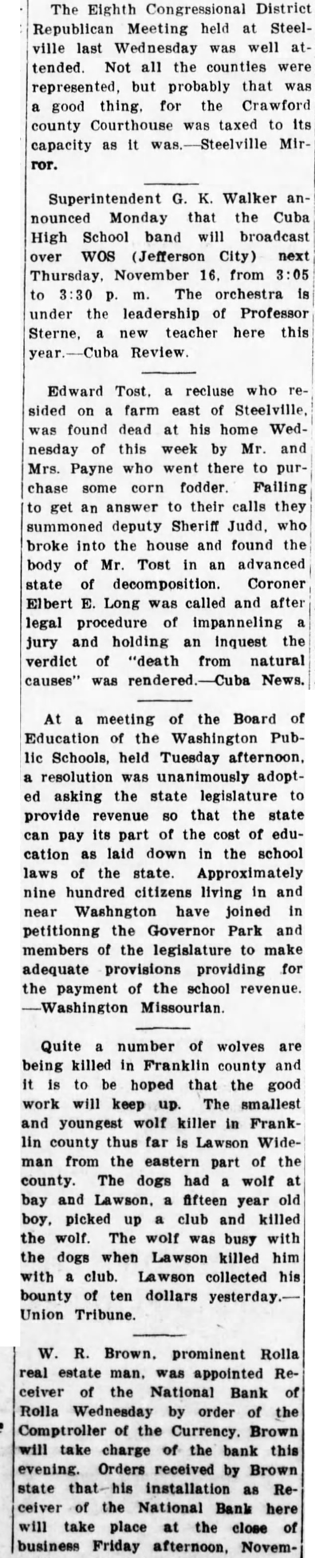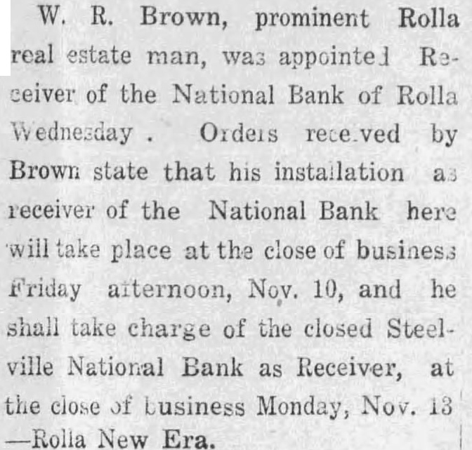 From Rolla New Era. W. R. Brown, prominent Rolla real estate man, was appointed Receiver of the National Bank of Rolla Wednesday by order of the Comptroller of the Currency. Brown has taken charge of the bank. Orders received by Brown state that his installation as Receiver of the National Bank here will take place at the close of business Friday afternoon, November 10, and he shall take charge of the closed Steelville National Bank as Receiver at the close of business Monday afternoon, November 13.
