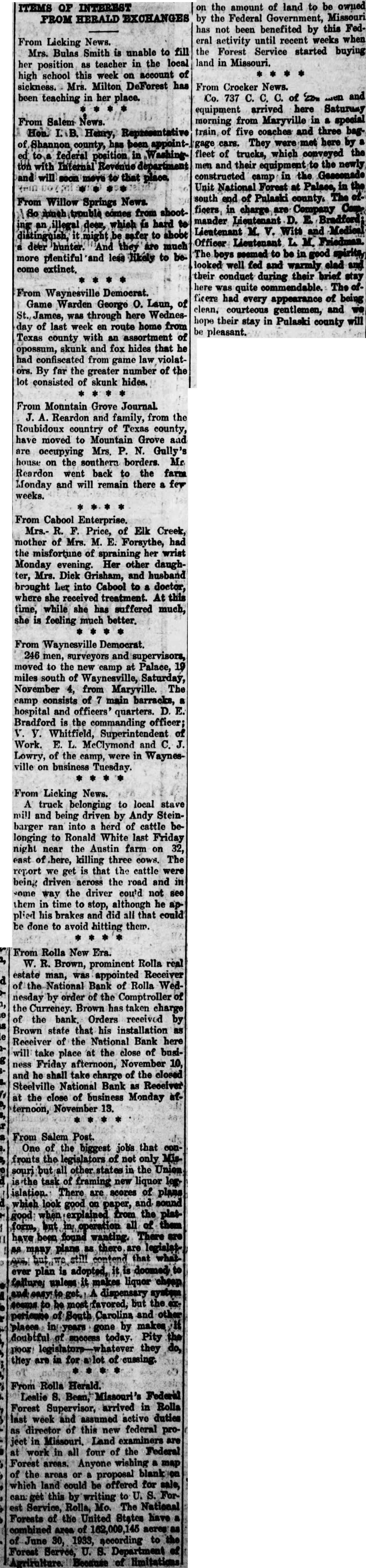 From Rolla Herald. Leslie S. Bean, Missouri's Federal Forest Supervisor, arrived in Rolla last week and assumed active duties as director of this new federal project in Missouri. Land examiners are at work in all four of the Federal Forest areas. Anyone wishing a map of the areas or a proposal blank which land could be offered for sale, can get this by writing to U. S. Forest Service, Rolla, Mo. The National Forests of the United States have a combined area of 162,009,145 acres as of June 30, 1933, according to the Forest Servee, U. S. Department of Agrirulture. Because of limitations on the amount of land to be owned by the Federal Government, Missouri has not been benefited by this Federal activity until recent weeks when the Forest Service started buying land in Missouri.