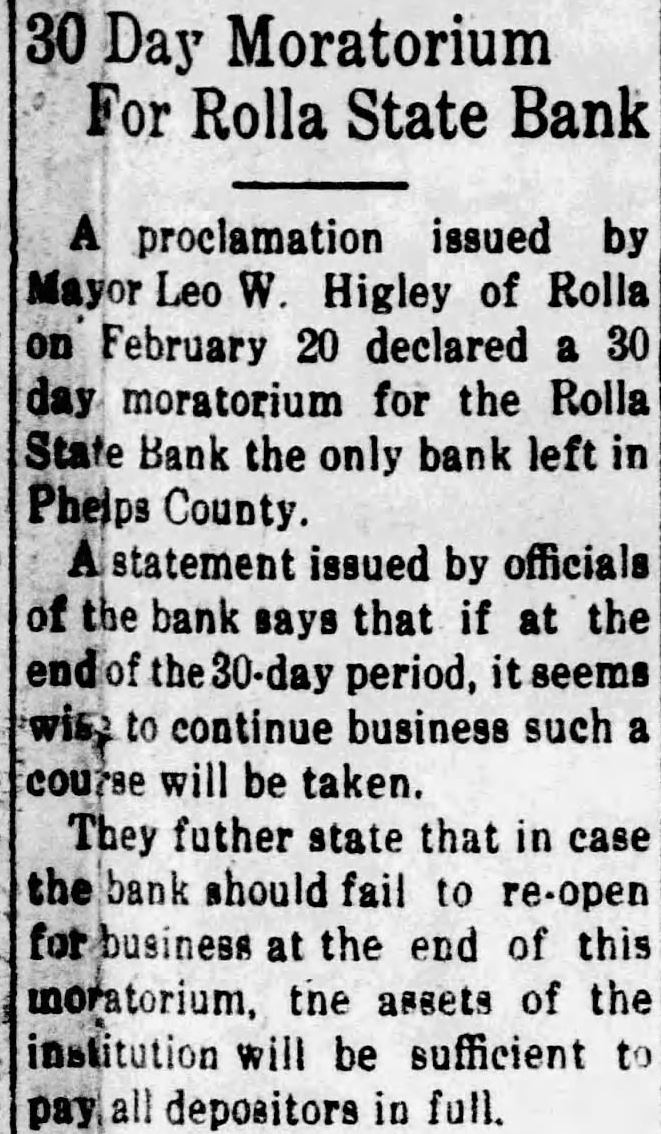 A proclamation issued by Mayor Leo W. Higley of Rolla on February 20 declared a 30 day moratorium for the Rolla State Bank the only bank left in Phelps County. Astatement issued by officials of the bank says that if at the end of the 30-day period, itseems wist to continue business such a course will be taken. They futher state that in case the bank should fail to re-open for business at the end of this moratorium, the assets of the institution will be sufficient to pay all depositors in full.