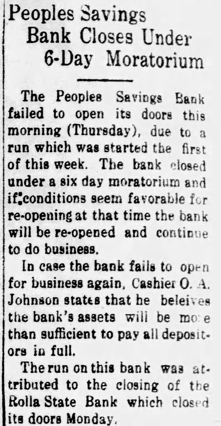 The Peoples Savings Bank failed to open its doors this morning (Thursday), due to a run which was started the first of this week. The bank closed under a six day moratorium and if:conditions seem favorable for re-opening at that time the bank will be re-opened and continue to do business. In case the bank fails to open for business again, Cashier 0. A. Johnson states that he beleives the bank's assets will be mo e than sufficient to pay all depositors in full. The run on this bank was attributed to the closing of the Rolla State Bank which closed its doors Monday